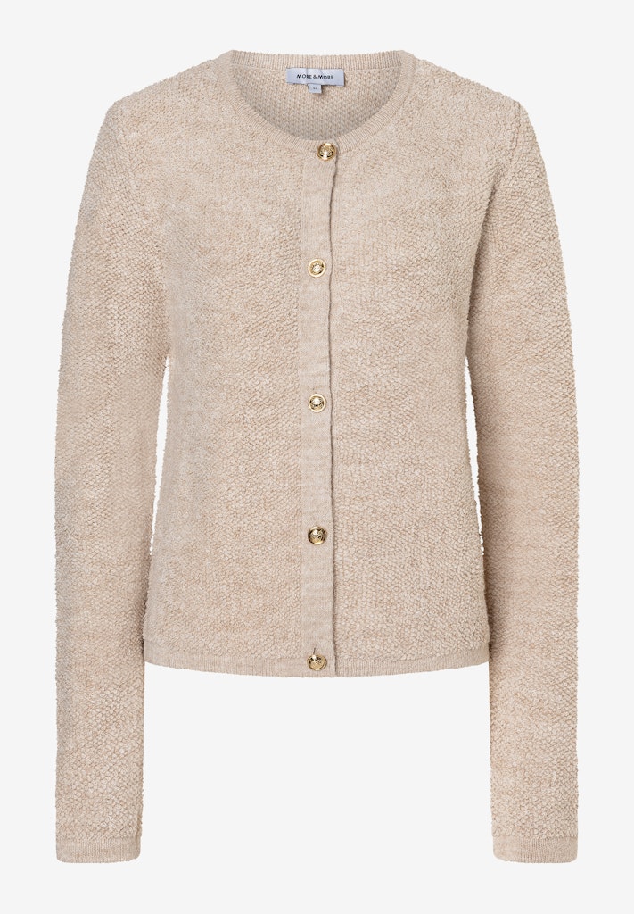 Die kuschelig-weiche Bouclé-Strickjacke von MORE & MORE mit goldfarbenen Knöpfen sieht zur weiten Marlenehose, lässigen Jeans oder zum fließenden Satinrock gleichermaßen gut aus.