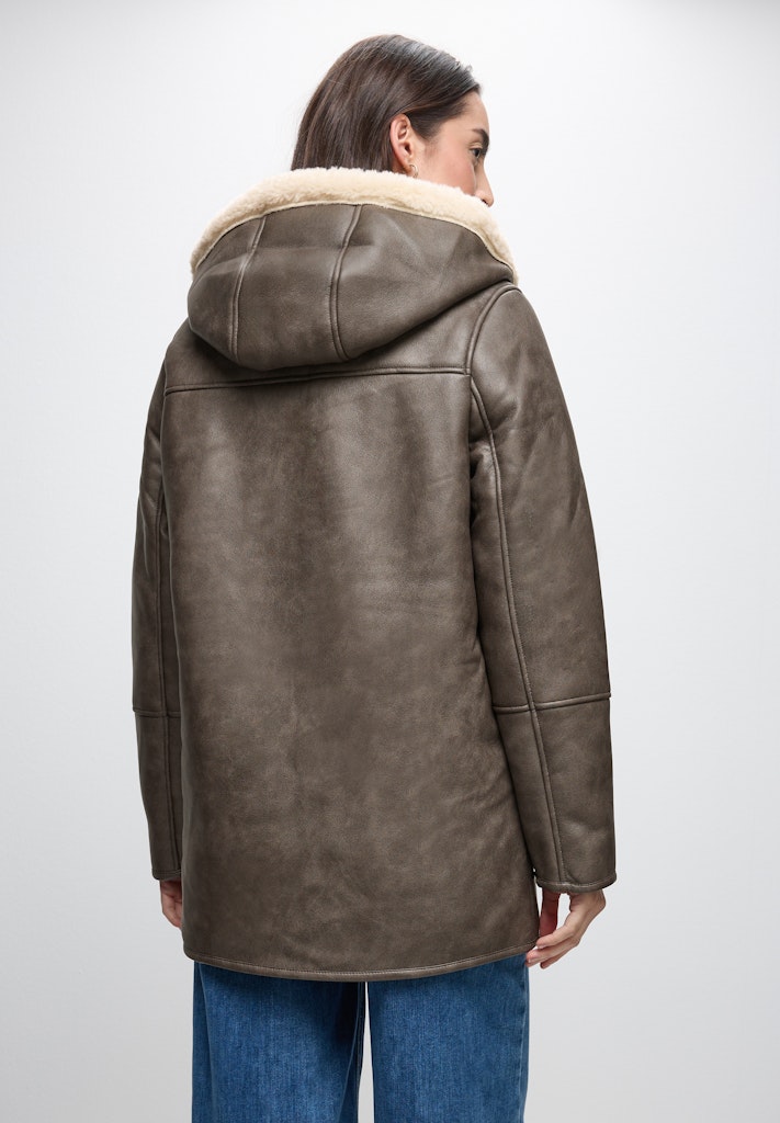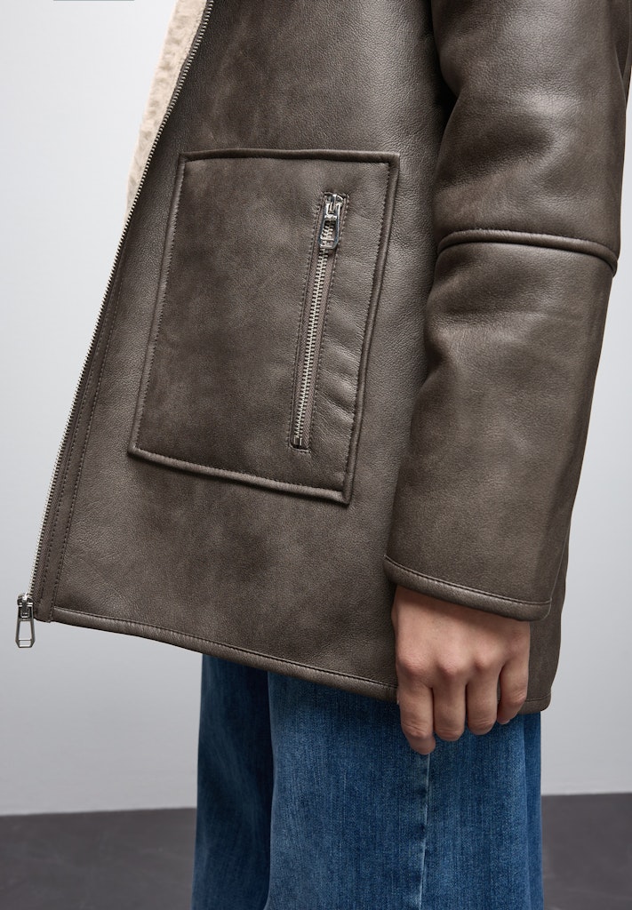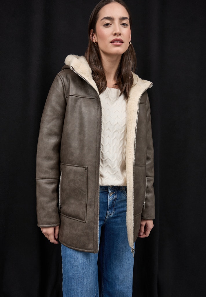 Diese Jacke von Street One für Damen begeistert mit coolem Leder-Look und modischen Details. Eine Kapuze mit Fake Fur Akzenten, seitliche Zipper-Taschen und ein Reißverschluss machen sie zum stylischen Begleiter. Die Kombination aus edgy Optik und weicher Haptik sorgt für einen modernen Auftritt mit Wohlfühlfaktor. Damenjacke Kapuze Seitliche Taschen mit Zipper Fake Fur Details Reißverschluss Material: Obermaterial: 100% Polyester; Futter: 100% Polyester