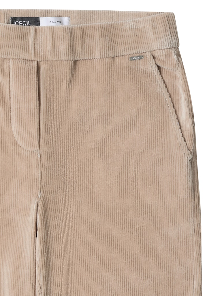 Die Cordhose von CECIL für Damen vereint modische Wide Legs mit hohem Tragekomfort. Im Loose Fit mit High Waist geschnitten und mit elastischem Bund versehen, bietet sie eine lässige Silhouette. Die softe Cordqualität mit breiter Struktur macht die Hose zum gemütlichen Hingucker für trendige Herbstlooks. Hose im Loose Fit High Waist und Wide Legs Seitliche Taschen Elastischer Bund Softe Cordqualität mit breiter Struktur Material: 65% Baumwolle, 33% Polyester, 2% Elasthan