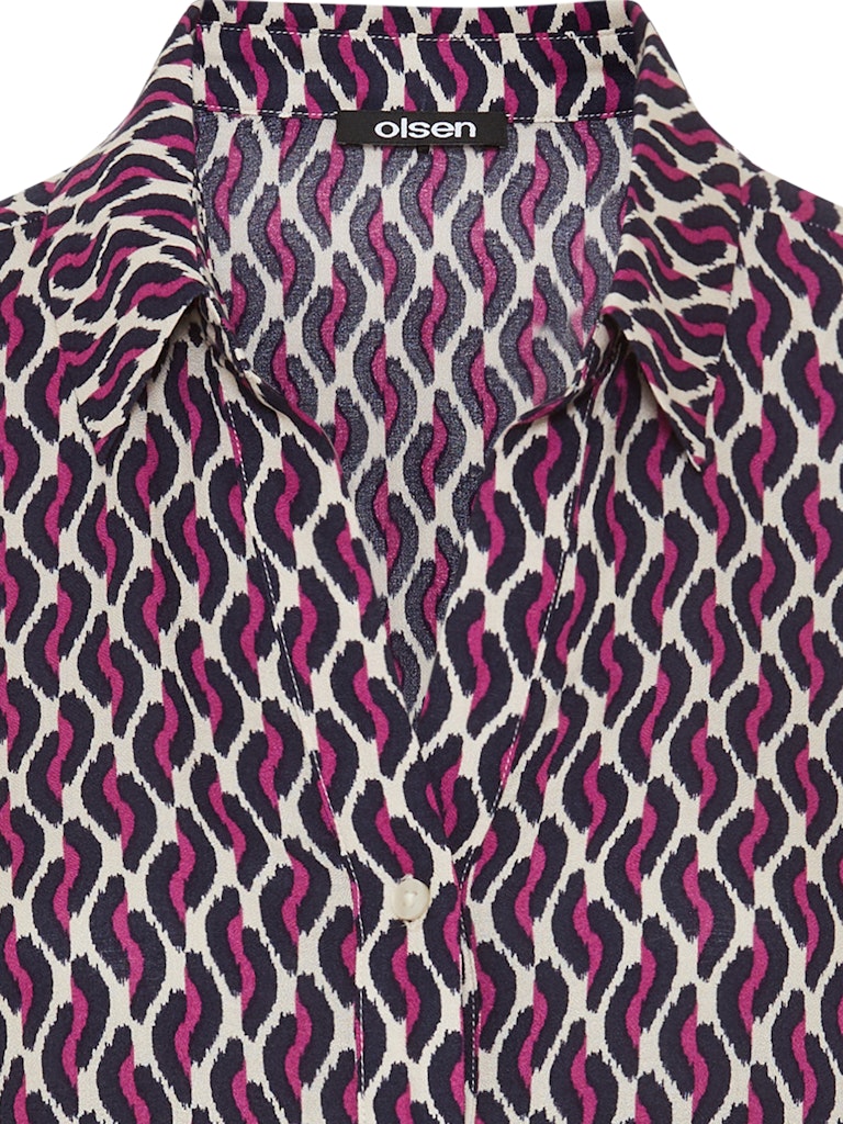 Mit ihrem farbenfrohen Allover-Design bringt diese Bluse Frische in jede Garderobe. Der offene Hemdkragen und die fließende Viskosequalität unterstreichen den femininen Look. Ein modischer Favorit für stilvolle Everyday-Outfits. Länge ca. 60 cm.