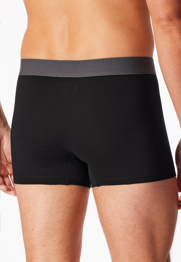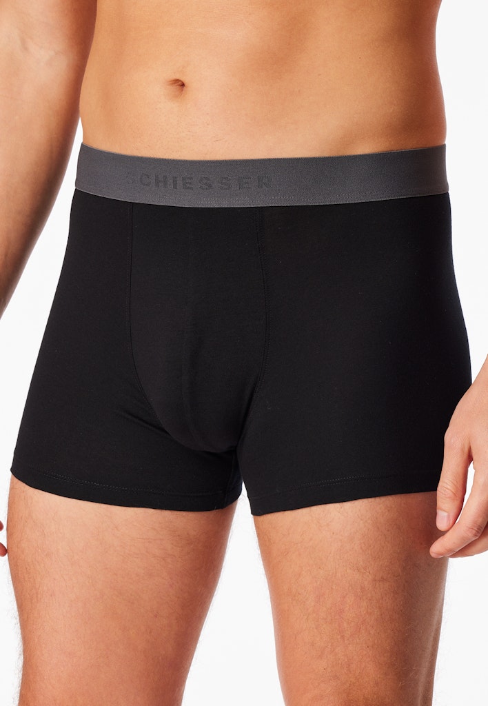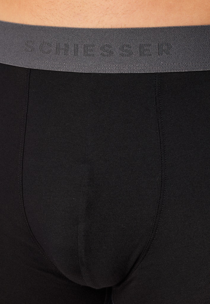 schwarze Herren-Shorts im 3er-Pack mit Webgummibund in Schwarz, Nachtblau und Grau, aus der beliebten SCHIESSER Serie "95/5", farblich abgesetzter, sportlicher Logo-Webgummibund, angenehm weich und formstabil dank 95 % natürlichem Organic Cotton und 5 % Elasthan, unsere Models tragen Größe [50/M], in perfekt sitzender, elastischer Single-Jersey-Qualität