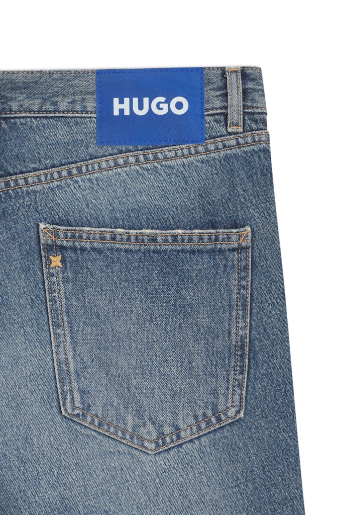 Crafted in authentic cotton denim with fading and whiskering, these HUGO Menswear jeans have an easy regular fit. Branded flag on coin pocket. This product contains at least 60% better raw materials. This piece is made with at least 60% cotton derived from regenerative agriculture. Regenerative agriculture prioritizes the preservation and restoration of natural environments, aiming to enhance biodiversity, maintain water quality, and improve soil health.