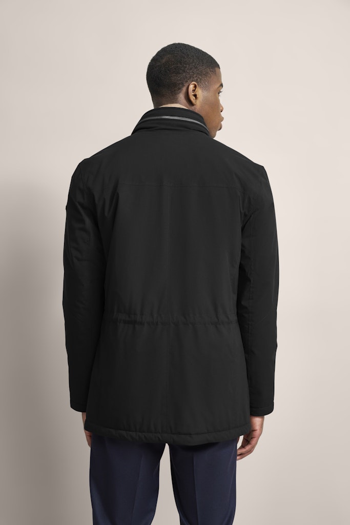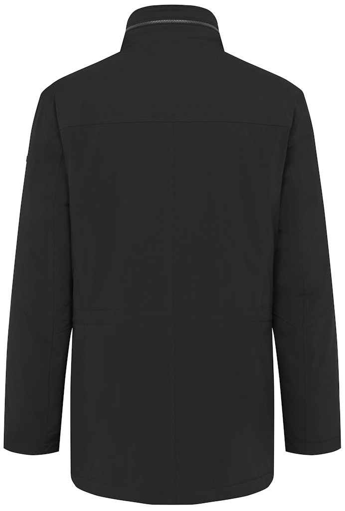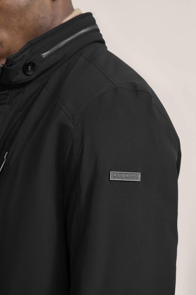 Ganzjahres Jacke mit Stehkragen, zwei schräge Leistentaschen mit Reißverschlüssen sowie eine gerade Reißverschluss-Brusttasche. Viele Steppnähte an Ärmel, Rumpf und Schulter. Innen ist die Jacke mit einem schlichtem Steppfutter gefüttert und bietet Stauraum durch zwei Innnetaschen. . Der Artikel überzeugt mit seiner wasserabweisenden Ausrüstung und seiner Struktur.