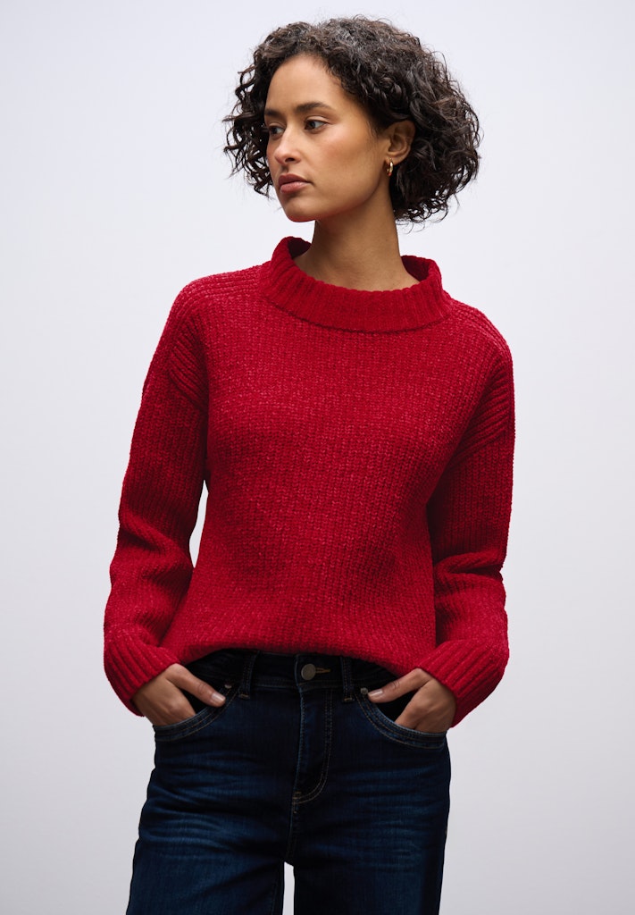 Der Strickpullover von Street One für Damen begeistert mit seiner kuscheligen Chenille-Qualität und macht jeden Look gemütlich und feminin. Strukturdetails an den Ärmeln und Rippbündchen setzen dezente Highlights. Der Rundhalsausschnitt rundet das Design klassisch ab und macht den Pullover zum perfekten Alltagsbegleiter. Strickpullover Rundhalsausschnitt Langarm mit Rippbündchen Strukturdetails an den Ärmeln Kuschelige Chenille Qualität Material: 87% Polyester, 13% Baumwolle
