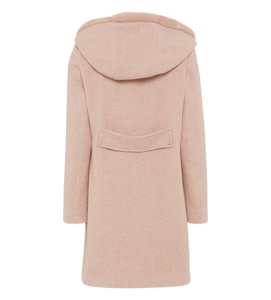 Wollkurzmantel, Fake Fur, angeschnittene Kapuze, Pattentaschen, Schlitztaschen, Knopfleiste, Made in Europe
