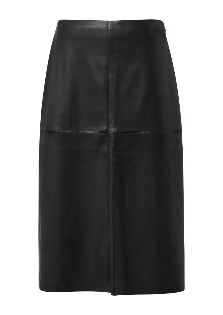 Dieser feminine Midi-Rock aus hochwertigem Kunstleder überzeugt durch seine elegante A-Linien-Silhouette. Mit mittlerer Bundhöhe und verdecktem Reißverschluss passt er perfekt zu deinem Alltags- und Business-Look.