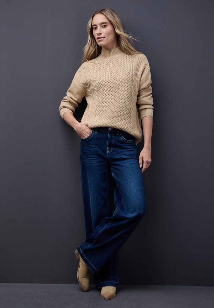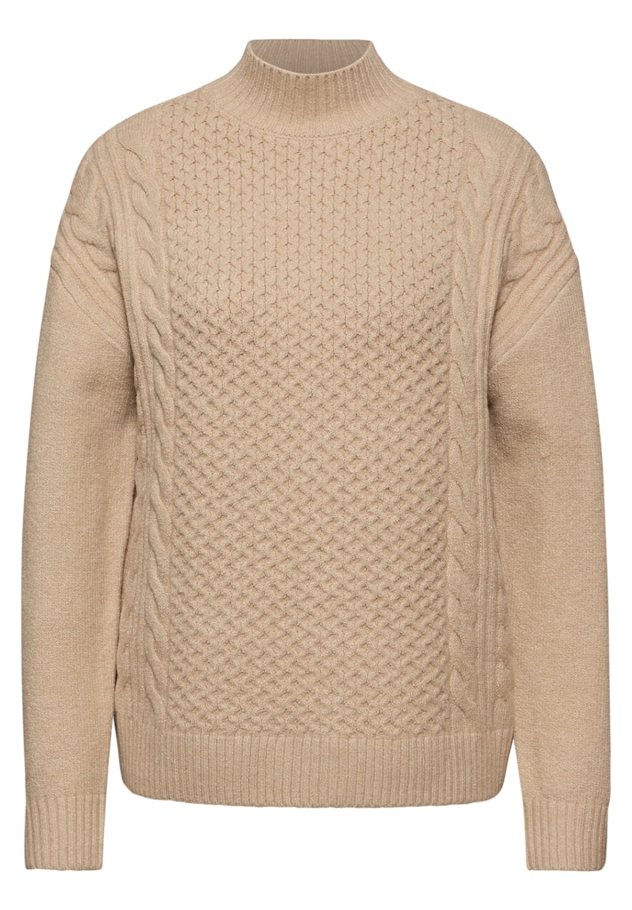 Der Grobstrickpullover von Street One bringt mit seinen schönen Strickmustern und dem kuscheligen Turtleneck Gemütlichkeit in deinen Look. Rippbündchen an den Ärmeln unterstreichen den lässigen Charakter. Ideal für kühle Tage und entspannte Casual-Outfits. Grobstrickpullover Schöne Strickmuster Turtleneck Langarm mit Rippbündchen Angenehmer Tragekomfort Material: 34% Baumwolle, 34% Polyacryl, 29% Polyester, 3% Elasthan