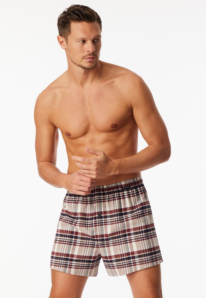Herren-Boxershorts im Doppelpack, 1x in Uni-Dunkelblau, 1x kariert in Brauntönen, aus der SCHIESSER Serie "X-Mas", zwei verschiedene Designs im Doppelpack, ideal als Geschenk, beide Shorts mit funktionaler Knopfleiste und einem sichtbaren Knopf, elastischer Mehrnadelbund mit schwarzem SCHIESSER Weblabel, unsere Models tragen Größe 38/M, aus hochwertiger Webware mit 100 % hautsympathischer Bio-Baumwolle