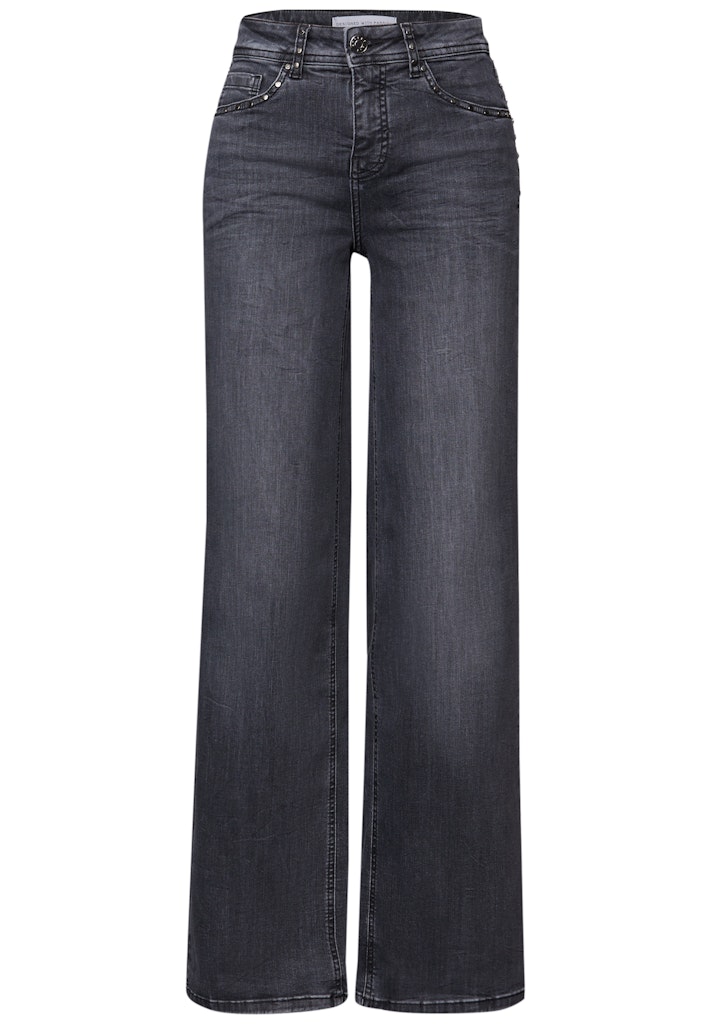Die Wide Leg Jeans von Street One für Damen kombiniert High Waist, weit geschnittene Beine und eine graue Waschung. Feine Glitzerdetails und der 5-Pocket-Style runden den Look trendstark ab. Loose Fit Hose High Waist und Wide Legs Graue Waschung Glitzerdetails 5-Pocket-Style Material: 82% Baumwolle, 15% Polyester, 3% Elasthan