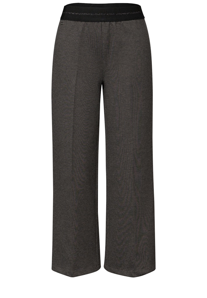 Mit dezentem Herringbone-Muster und weitem Beinverlauf bringt diese Hose von Street One für Damen Eleganz in den Alltag. Der hohe Bund und das weiche Material mit Stretchanteil garantieren ein angenehmes Tragegefühl. Der elastische Bund unterstreicht den bequemen Sitz. Ein modernes Must-have für Büro und Freizeit. Damenhose im Casual Fit High Waist und Wide Legs Elastischer Bund Viskosemix mit Stretchanteil Material: 72% Polyester, 25% Viskose, 3% Elasthan