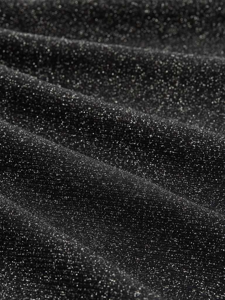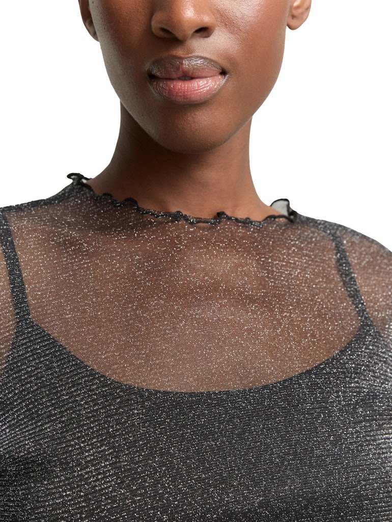 Slim Fit Longsleeve mit gewellten Saumkanten. Aus einem transparenten Mesh-Stoff mit Glitzer-Effekt.