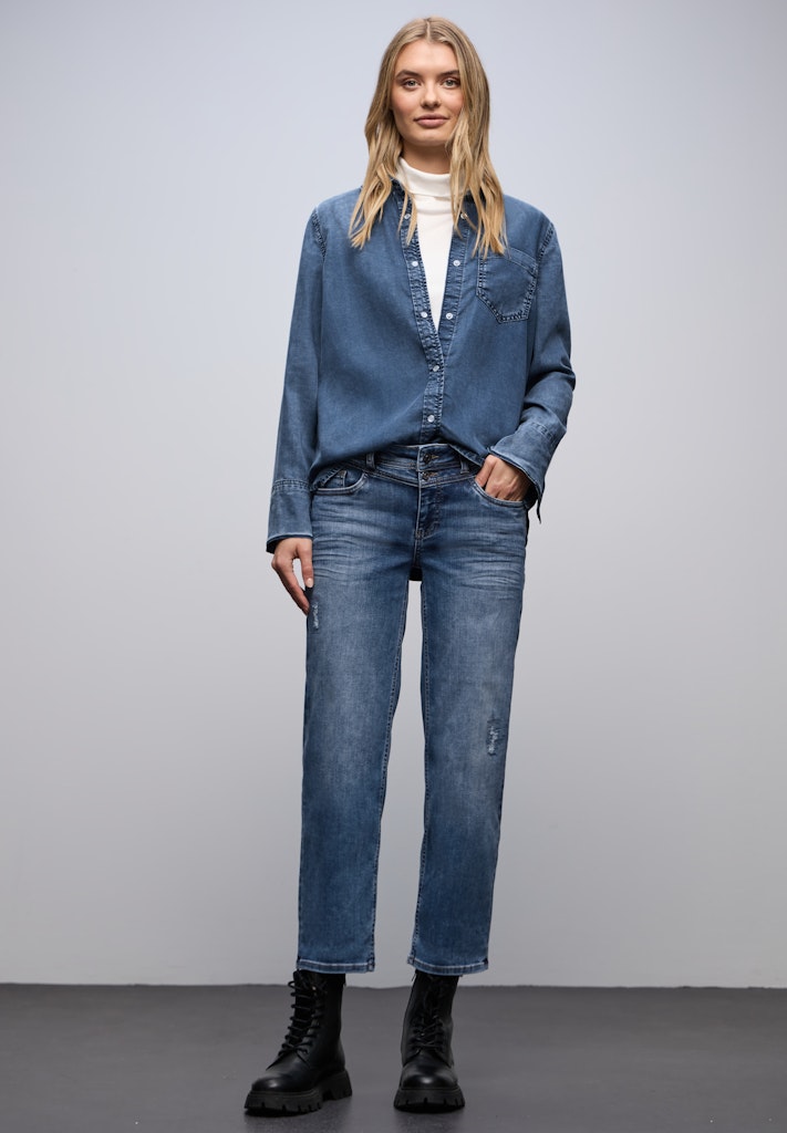 Die Jeans von Street One für Damen präsentiert sich im Casual Fit mit Mid Waist und Straight Legs. Destroyed Details und eine blaue Waschung verleihen ihr einen authentischen Denim-Look. Der Baumwollmix mit Stretchanteil sorgt für ein angenehmes Tragegefühl. Style Jane passt perfekt zu urbanen, lässigen Outfits. Jeanshose im Casual Fit Mid Waist und Straight Legs Destroyed Details Blaue Waschung Baumwollmix mit Stretchanteil Material: 82% Baumwolle, 16% Polyester, 2% Elasthan