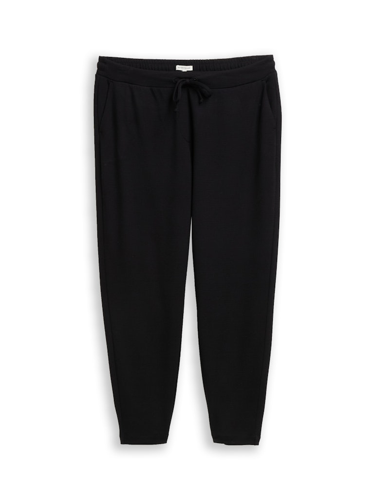 Locker geschnittene Stoffhose mit elastischem Gummibund und Schleife, seitlichen Eingriffstaschen und Paspeltasche hinten.