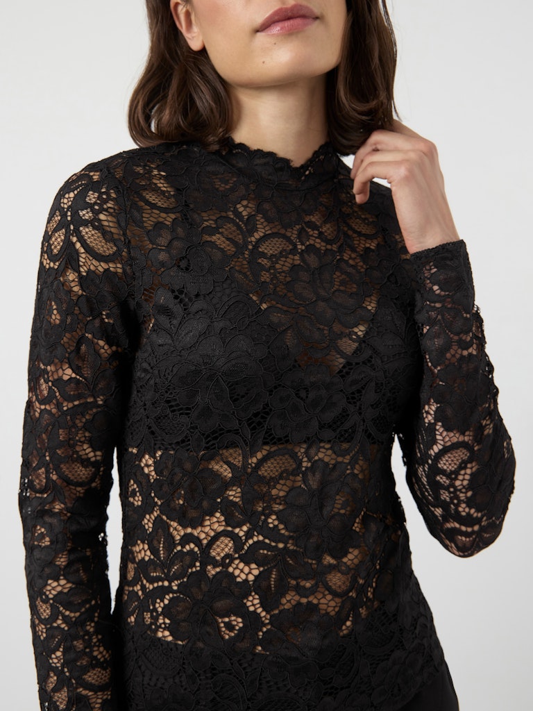 Schaffe die perfekte Basis für deinen Look mit unseren zeitlosen Basics, die deine Outfits perfekt ergänzen.Dieser Style besteht aus einem zarten Spitzenstoff mit femininen Mustern für einen edlen Look.- Produktart : Bluse- Ausschnitt : Hoher Kragen- Ärmel : Lange Ärmel- Verschluss : Knopfverschluss- Passform : Slim Fit