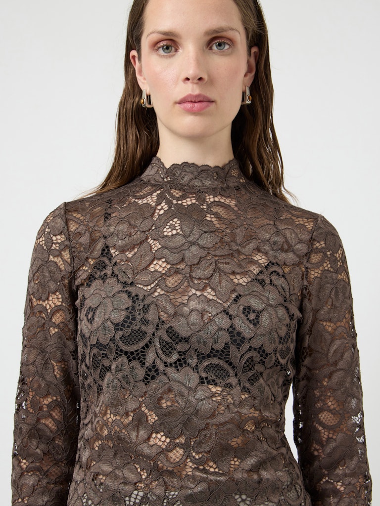 Dieser Style besteht aus einem zarten Spitzenstoff mit femininen Mustern für einen besonders schicken Look.