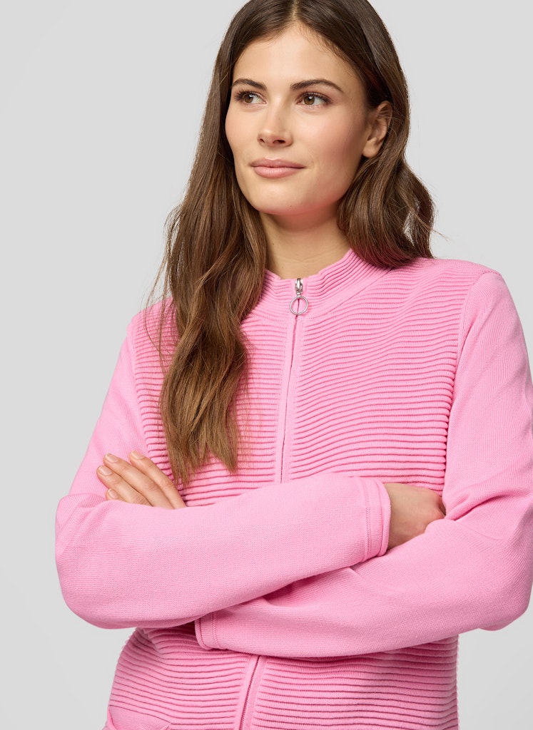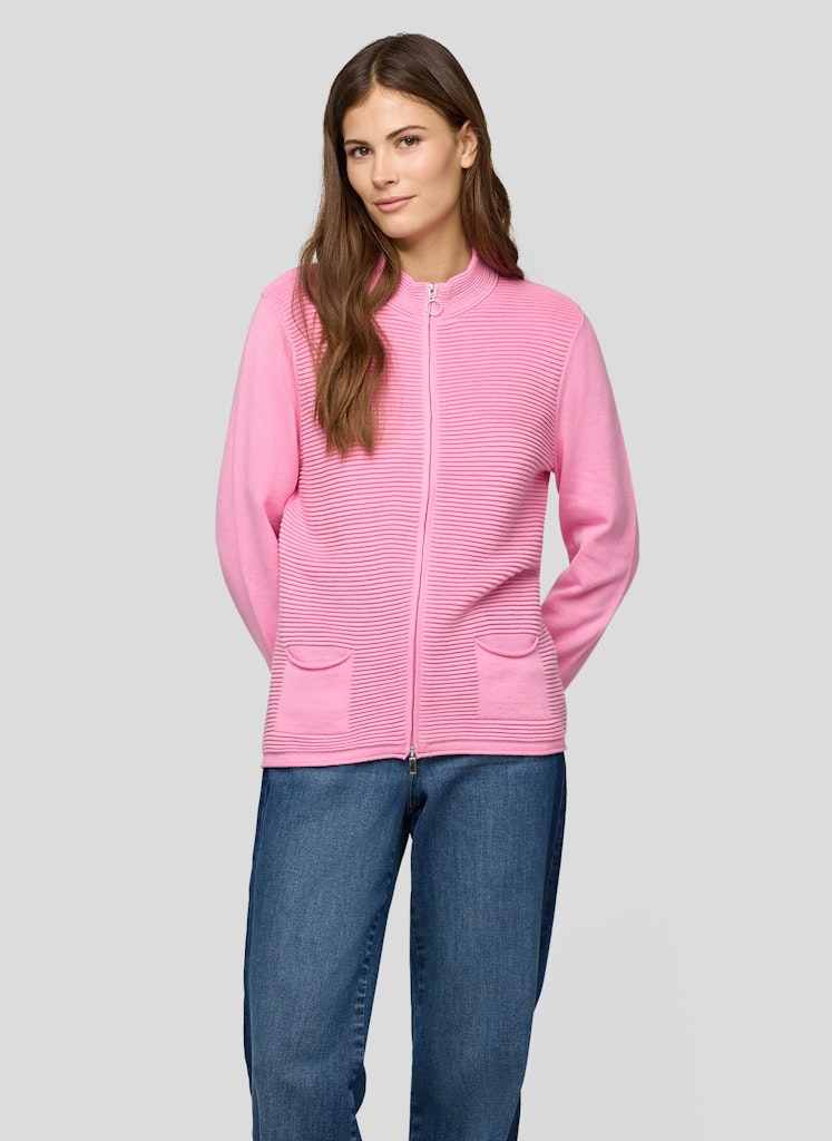 Diese Jacke überzeugt durch ihr raffiniertes Spiel mit Struktur: Die Vorderseite ist mit einer feinen Rippenstruktur gearbeitet, während Ärmel und Rückseite glatt gehalten sind. Der durchgehende Reißverschluss mit Ringzipper rundet den Look sportlich ab. Zwei aufgesetzte Taschen vorn bieten Platz für Kleinigkeiten. Die weiche Baumwollmischung liegt angenehm auf der Haut und sorgt für ein gutes Tragegefühl. Mit strukturiertem Frontbereich. Aufgesetzte Taschen vorn. Durchgehender Reißverschluss. Kleiner Stehkragen. Trageangenehme Baumwollmischung.