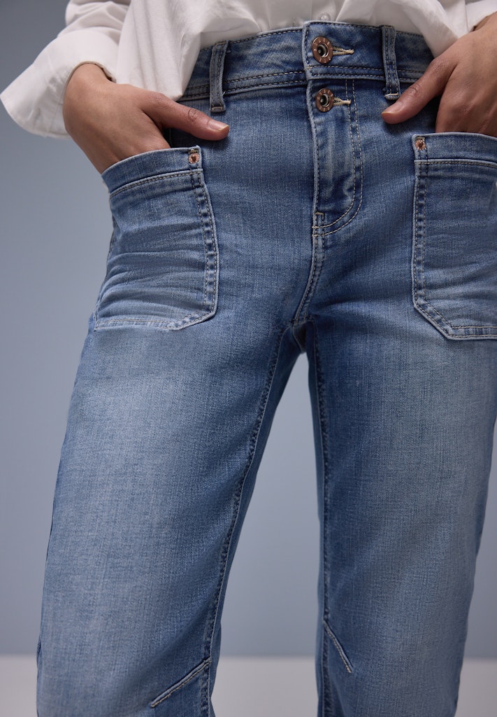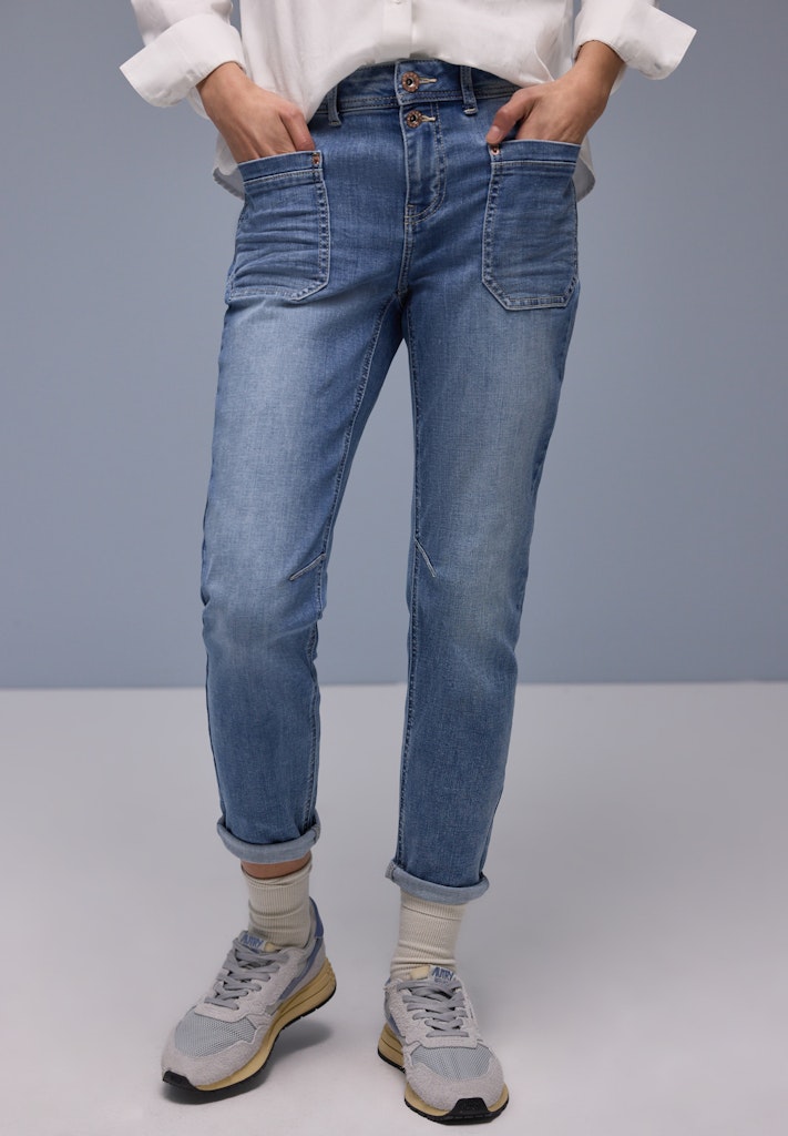 Die Boyfriend Jeans im Style Charlie von Street One für Damen bringt mit ihrem lockeren Loose Fit und den Tapered Legs eine lässige Note in deinen Look. Die blaue Waschung verleiht der Denim Hose einen klassischen Touch, während der elastische Baumwollmix für ein angenehmes Tragegefühl sorgt. Perfekt für entspannte Alltagsoutfits mit Stil. Jeanshose Loose Fit Tapered Legs Mid Waist Bequem und elastisch Material: 63% Baumwolle, 23% Polyester, 12% Viskose, 2% Elasthan