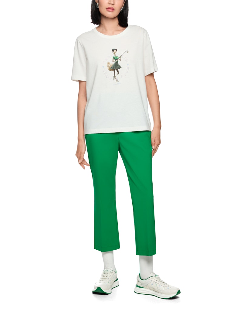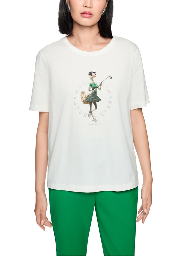 Shirt mit Vogelstrauß "Rethink Together"|Locker geschnittenes Rundhals-Shirt aus 100 % Biobaumwolle mit kurzen Ärmeln. Highlight ist das humorvolle Motiv eines golfspielenden Vogelstraußes. Der Aufdruck Marc Cain Sports Club mit kleinen Strasssteinchen verleiht dem Design einen funkelnden Akzent. Das Shirt trägt das Nachhaltigkeitslabel "Rethink Together".|Locker geschnitten|Rundhals|Kurze Ärmel|Verzierung mit Strasssteinchen|Das Model ist 179 cm groß und trägt N3/38.