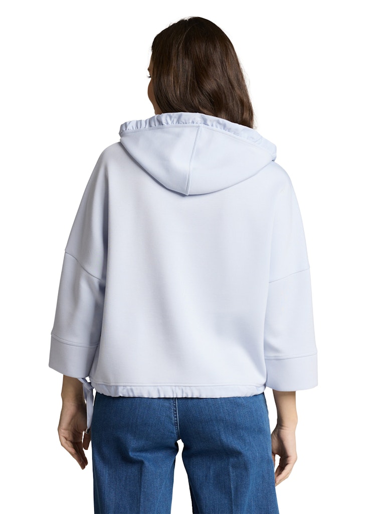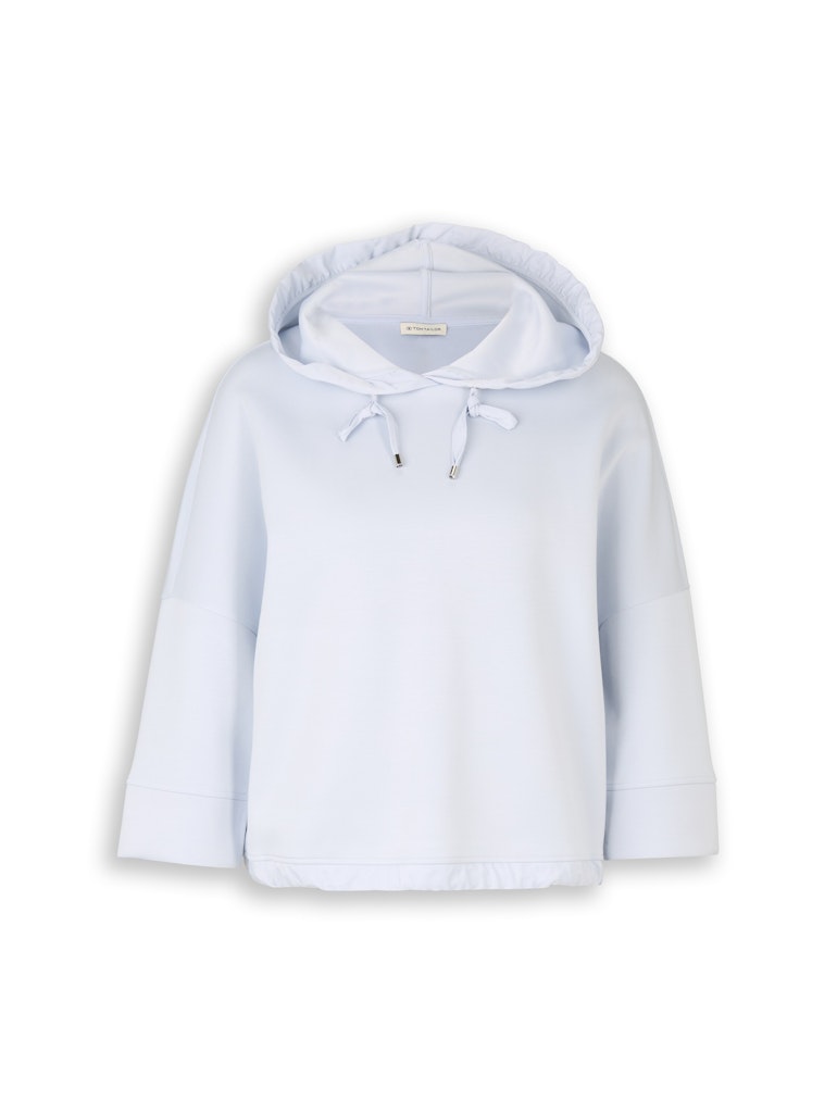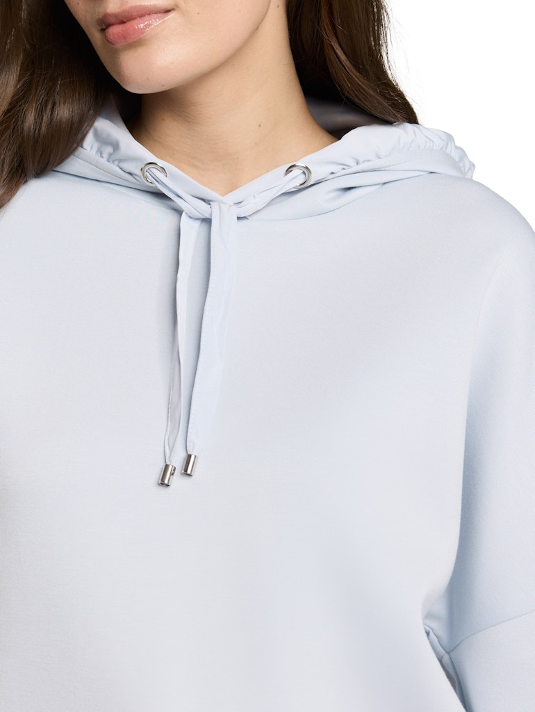 Hoodie Sweatshirt mit 7/8-Arm und überschnittener Schulternaht. Mit Kordelzug an der Kapuze und am Saum. Aus einem knitterarmen, elastischen und neoprenähnlichen Scuba-Material.