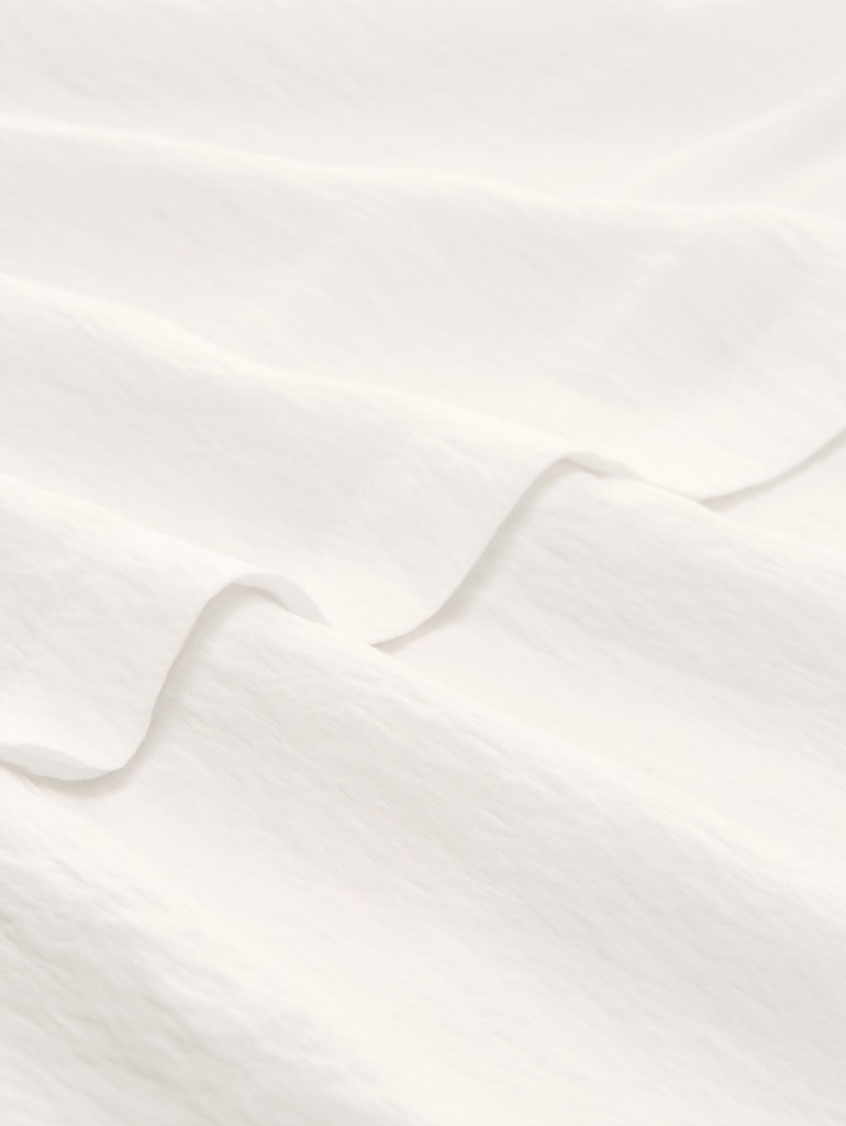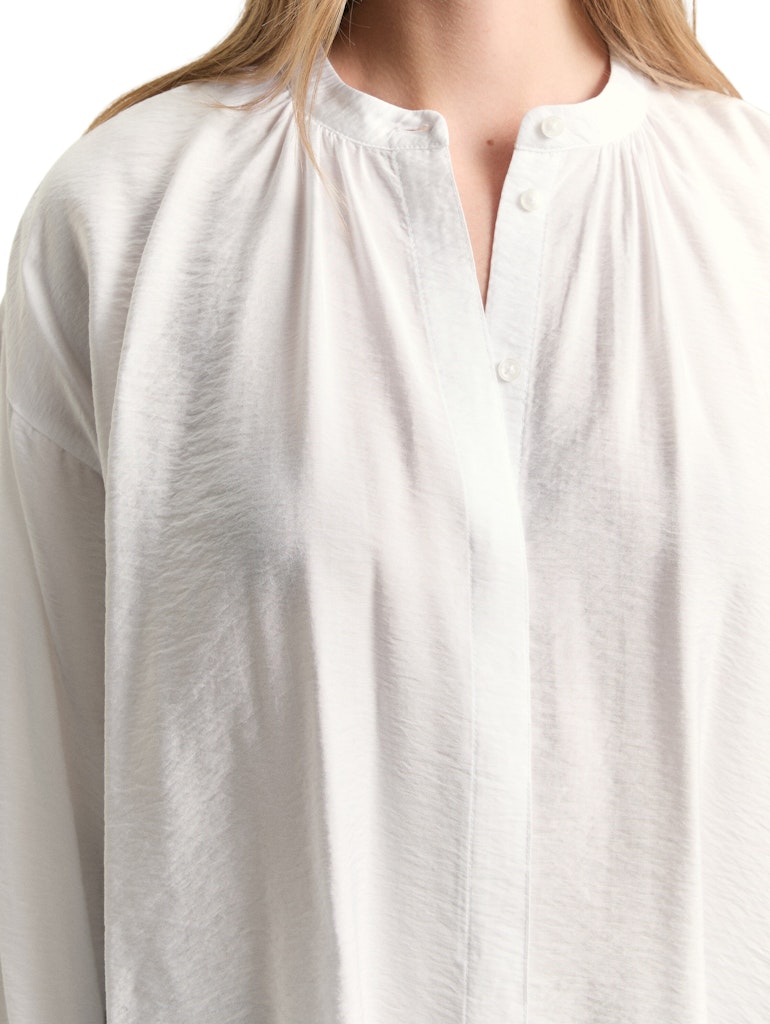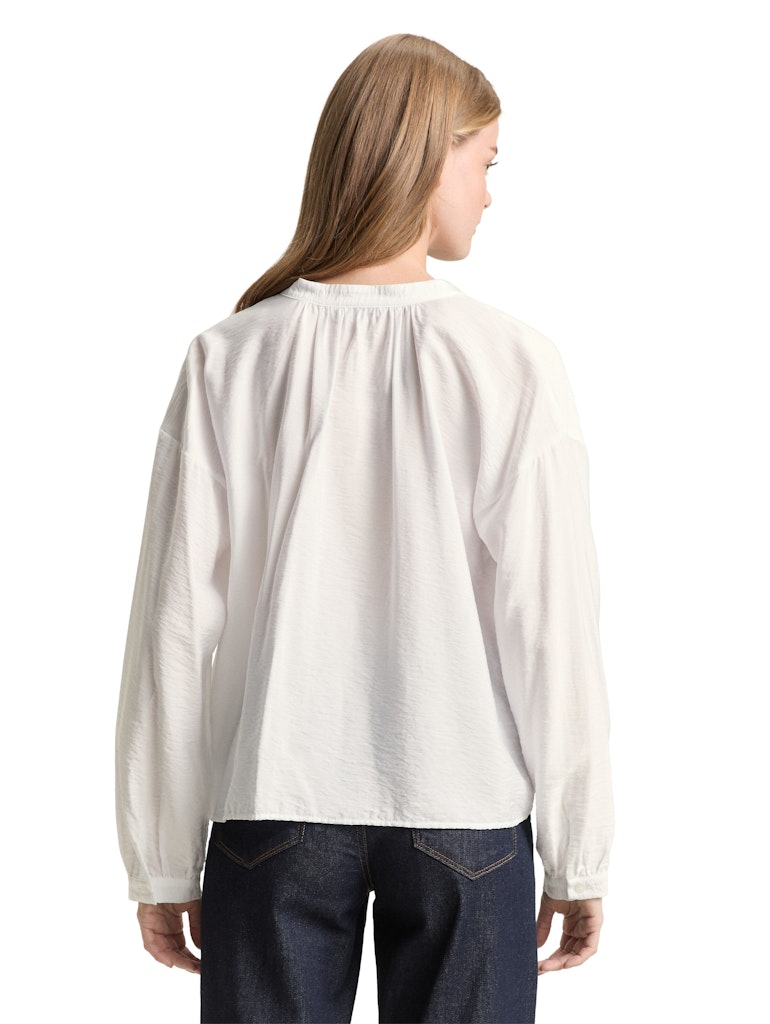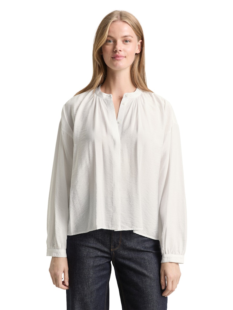 Locker geschnittene Bluse mit verdeckter Knopfleiste, Raffungen am Ausschnitt und Ballonärmeln. Aus einem strukturierten Krepp-Material.
