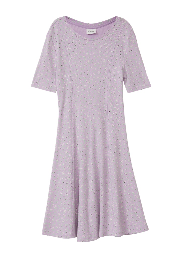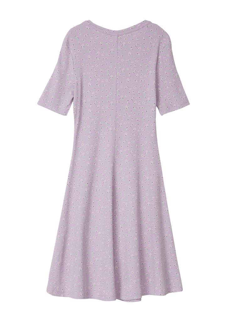 Dieses elastische Kleid in Rippstruktur begeistert mit seinem farbenfrohen All-over-Print. Der weiche Baumwollmix mit Stretch sorgt für hohen Tragekomfort und optimale Bewegungsfreiheit. Der ausgestellte Saum und die Kurzarm-Form machen es zum idealen Begleiter für warme Tage, Schulausflüge oder entspannte Freizeitnachmittage.