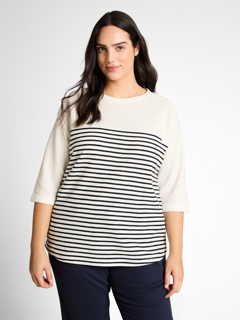 Longsleeve im maritimen Look mit Streifenmuster auf der Vorderseite und Deko-Knopfleiste an den Schultern. Mit fixiertem Ärmelaufschlag am 3/4-Arm. Aus einem strukturierten Jacquard-Stoff mit Baumwolle.