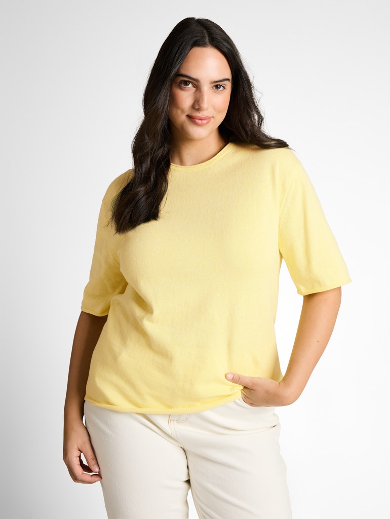 Kurzärmliger Pullover mit Rundhalsausschnitt und überschnittener Schulternaht für eine lockere Passform. Aus einer weichen Mischung aus Kaschmir und Baumwolle für ein besonders warmes und angenehmes Tragegefühl.