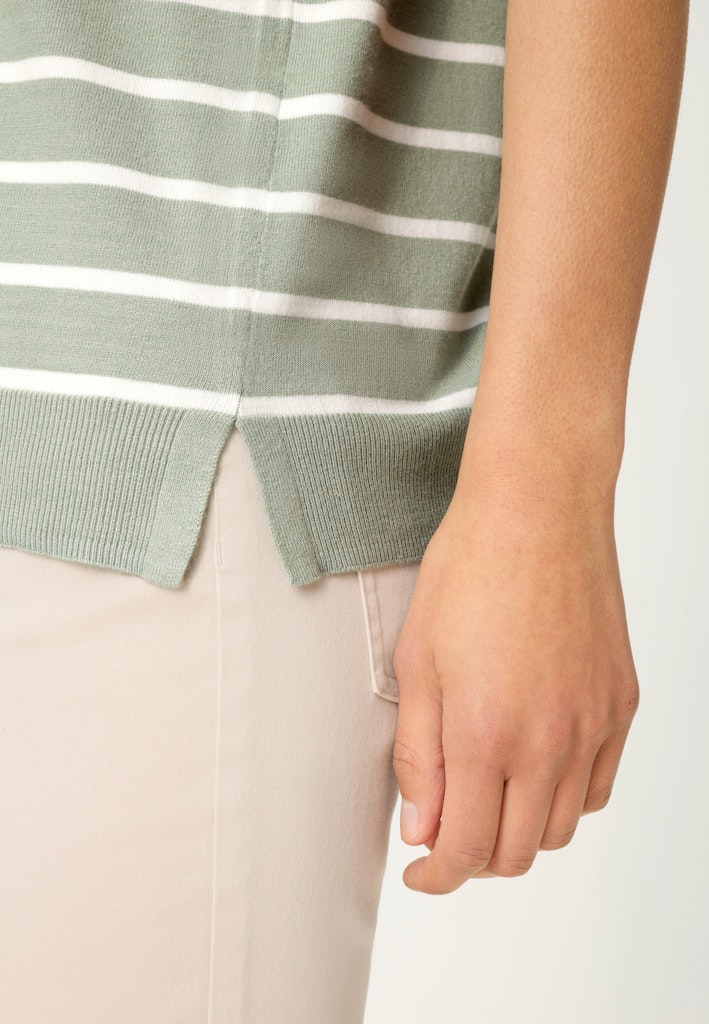 Dieser Feinstrickpullover kombiniert klassischen Streifen-Look mit modernem Komfort. Gefertigt aus einer fließenden Viskosemischung, überzeugt er durch eine glatte Oberfläche und ein besonders angenehmes Tragegefühl. Der Rundhalsausschnitt und die halblangen Ärmel verleihen dem Design eine feminine Note, während der gerade Saum die Olsen-Passform "Henny" stilvoll abrundet. Länge ca. 60 cm.