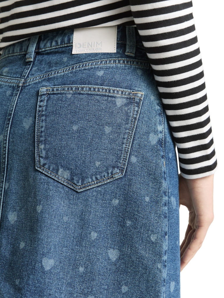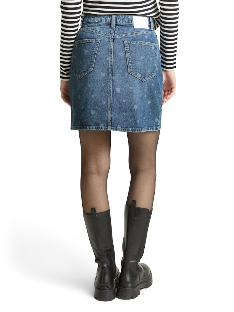Kurzer Jeansrock Herz-Allover-Print. Im Five-Pocket-Style mit seitlichen Eingriffstaschen vorne und aufgesetzten Taschen hinten.