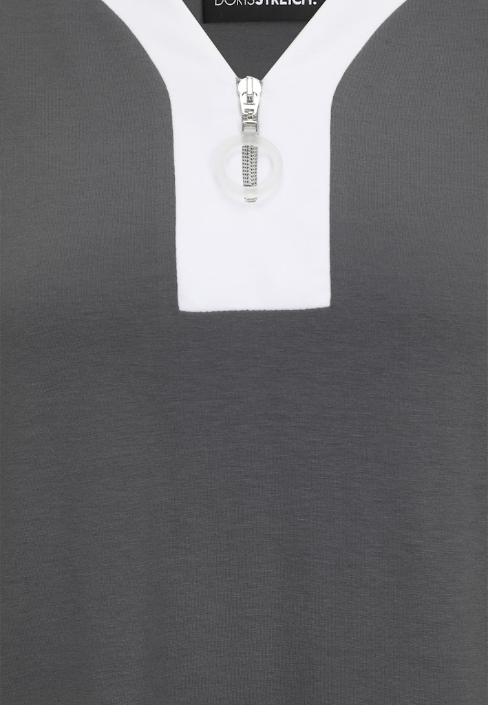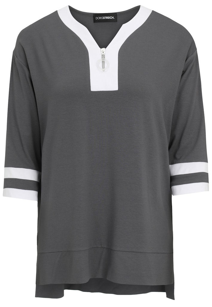 Materialmischung fällt leger. Der dekorative weiße Einsatz rund um den Halsausschnitt, der Reißverschluss mit dekorativem Anhänger und die Einsätze am Ärmelabschluss macht diesen Style zum neuen Lieblingsteil Ihrer Garderobe.