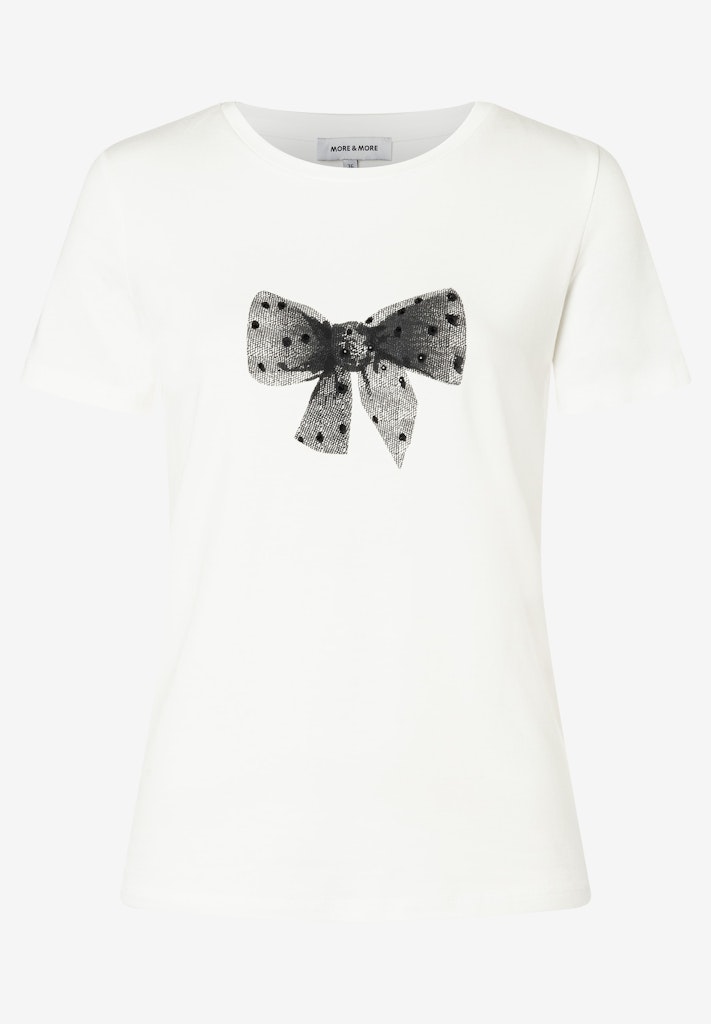 Das feminine Kurzarmshirt von MORE & MORE überzeugt mit dekorativem Frontprint und ist ein absolutes Allround-Talent. Der süße Schleifenaufdruck mit schwarz-glänzenden Strasssteinchen setzt einen stilvollen Akzent und verleiht dem schlichten Shirt eine besondere Note - perfekt für unkomplizierte Looks mit modischem Twist.