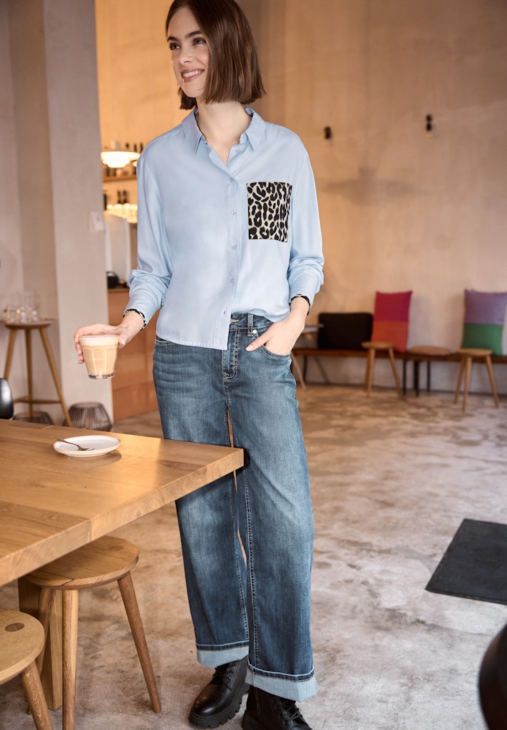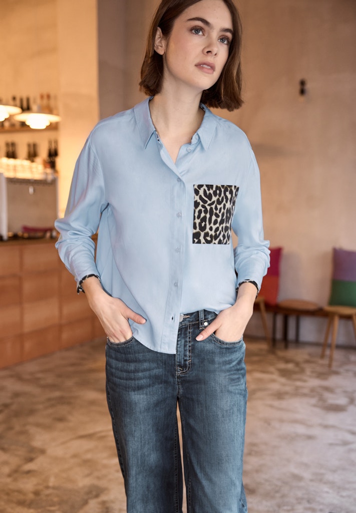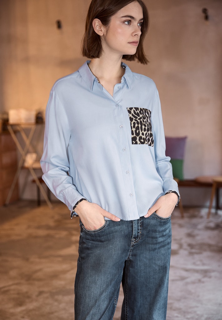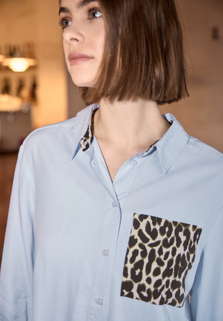 Die Hemdbluse von Street One Studio für Damen überzeugt durch ihre weiche Viskosequalität und eine Brusttasche im Leo-Look. Der Animal Print setzt modische Akzente, während der gerundete Saum und die softe Qualität für einen lässigen Sitz und einen angenehmen Tragekomfort sorgen. Die Knopfleiste und weitere Leo-details an den Bündchen runden den Look ab. Ideal für stylische Freizeitoutfits. Viskosebluse Casual Hemdkragen Langarm Modern und lässig Material: 100% Viskose