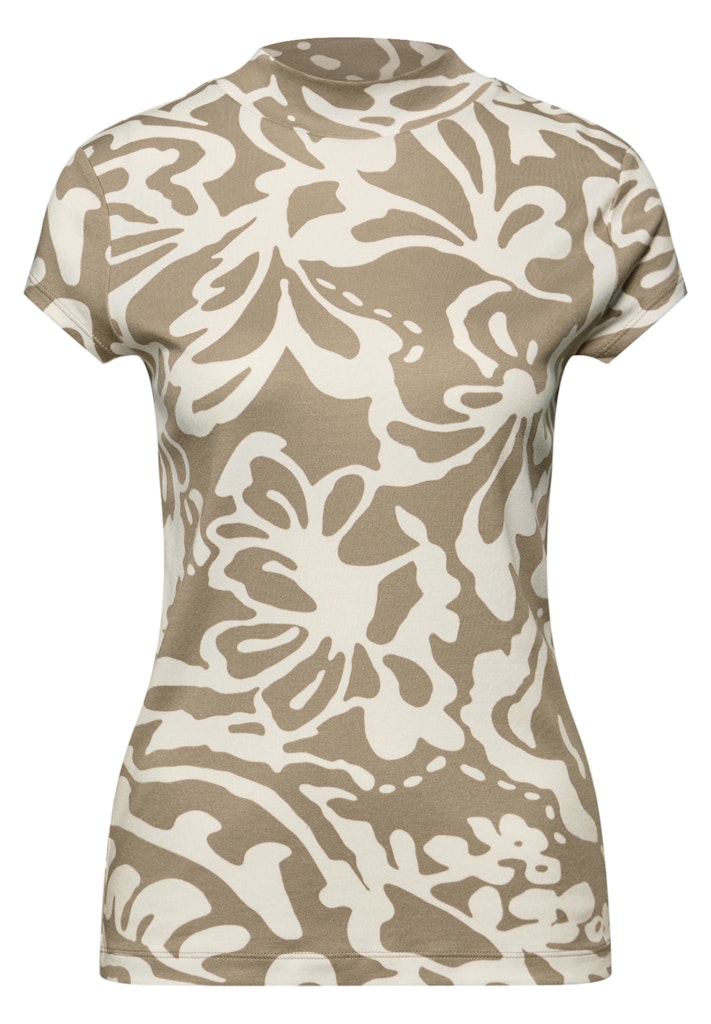 Das gemusterte Basic Shirt von Street One für Damen kombiniert einen modischen Turtleneck mit einem feinen grafischen Muster mit floralen Elementen. Die weiche Qualität mit Baumwoll-Modalmix bietet dir ein angenehm leichtes Tragegefühl. Ein figurschmeichelndes Piece, das jedem Outfit eine stilvolle Note verleiht. Jerseyshirt Casual Turtleneck Kurzarm Figurschmeichelnd Material: 50% Baumwolle, 50% Modal