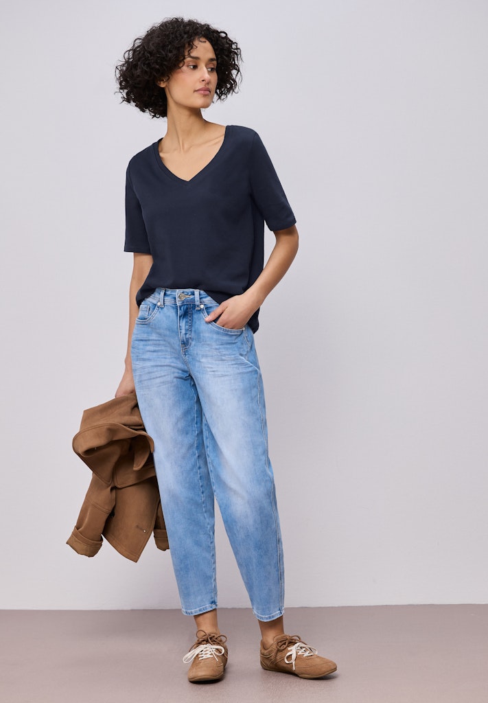 Dieses Basic T-Shirt von Street One für Damen ist ein unkomplizierter Begleiter für jeden Tag. Die reine Baumwolle fühlt sich angenehm weich auf der Haut an und bietet dir gemütlichen Komfort. Der V-Ausschnitt und der schlichte Look machen das Jerseyshirt vielseitig einsetzbar – perfekt für entspannte Casual-Outfits. Die Unifarbe erlaubt dir müheloses Kombinieren Jerseyshirt Casual V-Ausschnitt Kurzarm Schlicht und bequem Material: 100% Baumwolle