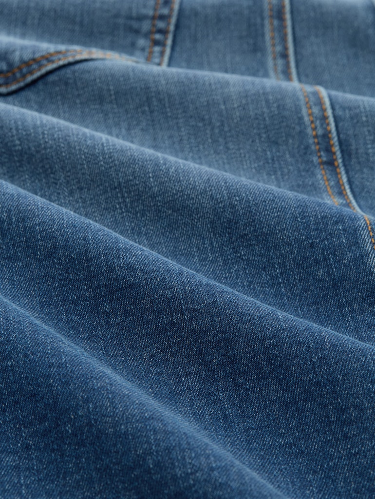 Jeansrock in Midi-Länge mit Schlitz auf der Vorderseite. Im Five-Pocket-Style mit seitlichen Eingriffstaschen vorne und aufgesetzten Taschen hinten.