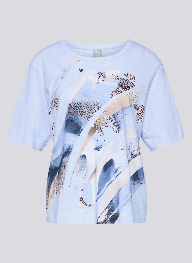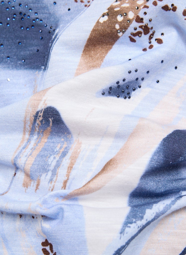Der angenehme Materialmix aus Baumwolle und Modal fühlt sich besonders weich und leicht auf der Haut an und sorgt für ein luftiges Tragegefühl. Der großflächige Frontprint verleiht dem Modell eine moderne, künstlerische Optik, während feine Strasssteine dezente Glanzpunkte setzen. Ein kleines Herzmotiv im Nacken rundet das Design liebevoll ab. Der lockere Schnitt macht das Shirt zu einem vielseitigen Begleiter für entspannte Alltagslooks. Baumwolle-Modal-Mix. Weich und leicht. Mit Strassdetails. Frontprint. Lockerer Schnitt.