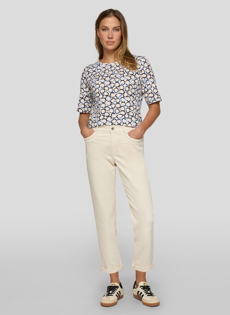 Dieses Shirt aus einer Baumwollmischung mit Elasthan trägt sich angenehm weich und passt sich durch den Stretchanteil komfortabel der Figur an. Die hochwertige Jersey-Qualität sorgt für Bewegungsfreiheit und ein gutes Hautgefühl. Der klassische Rundhalsausschnitt und die halblangen Ärmel verleihen dem Modell eine zeitlose Silhouette. Das grafische Kreisdessin bringt frische Dynamik in den Look und macht das Shirt zu einem vielseitigen Kombipartner für den Alltag. Baumwolle mit Elasthan. Weiche Jersey-Qualität. Rundhalsausschnitt. Halblange Ärmel. Grafisches Alloverdessin.