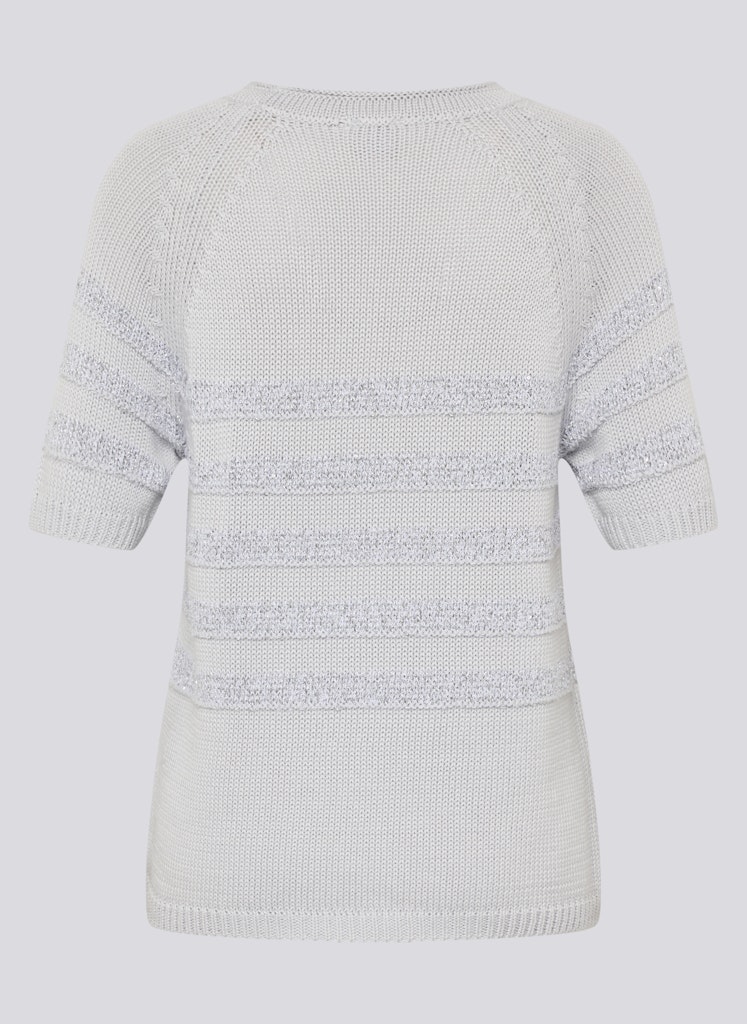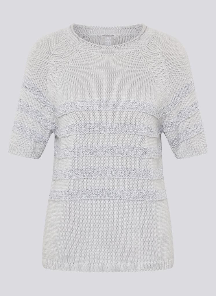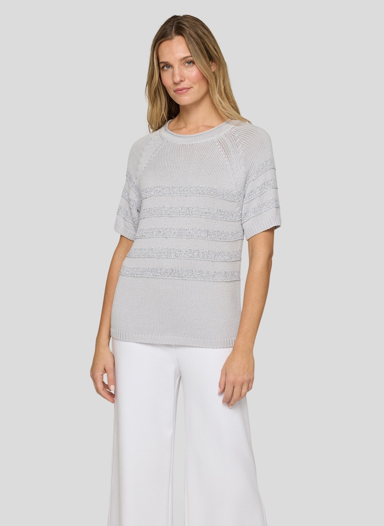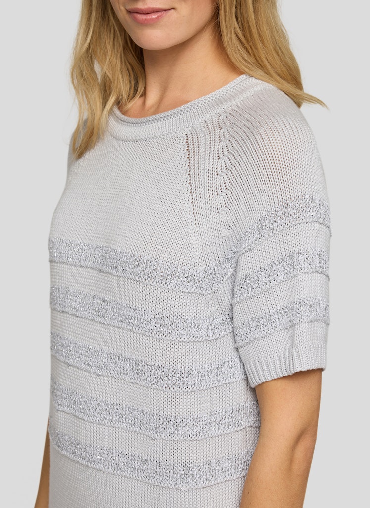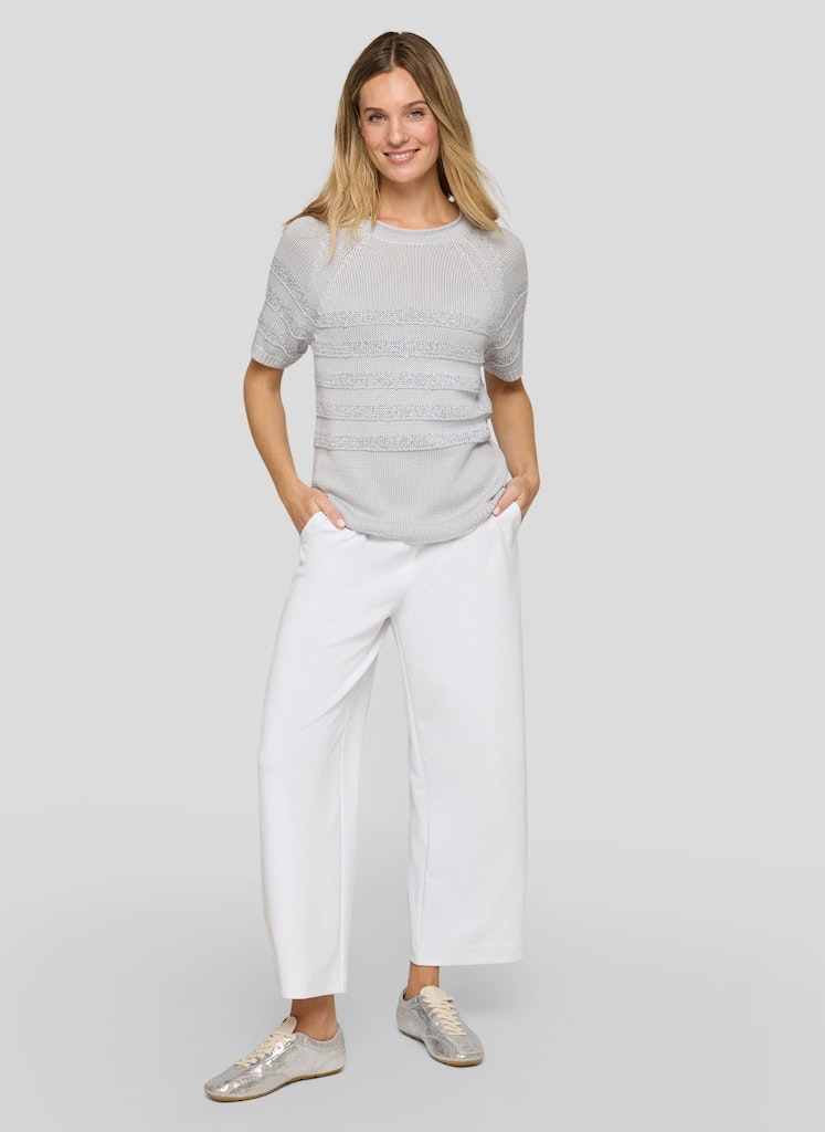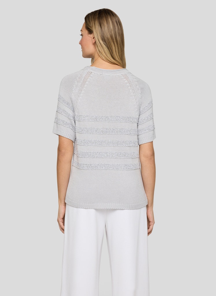 Dieser Pullover kombiniert unterschiedliche Garnarten zu einer besonderen Oberfläche mit feinen Glanzakzenten. Der Baumwollanteil sorgt für ein angenehmes Hautgefühl, während Polyacryl und Polyester Formstabilität und Pflegeleichtigkeit unterstützen. Viskose verleiht zusätzliche Weichheit, und Maguey- sowie Polyamidfasern erhöhen Strapazierfähigkeit und Haltbarkeit. Die kurzen Raglanärmel und die dezent schimmernden Strukturstreifen machen das Modell zu einem vielseitigen Begleiter für stilvolle Alltagslooks. Strukturstrick mit Glanzeffekten. Kurze Raglanärmel. Rundhalsausschnitt. Weicher Materialmix. Formstabil und pflegeleicht.