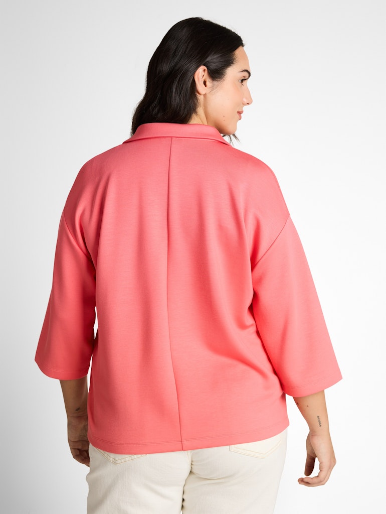 Longsleeve mit 3/4-Arm und Polokragen. Mit Ziernaht auf der Rückseite und überschnittener Schulternaht für eine lockere Passform. Aus einem weichen, knitterarmen und elastischen Scuba-Stoff.