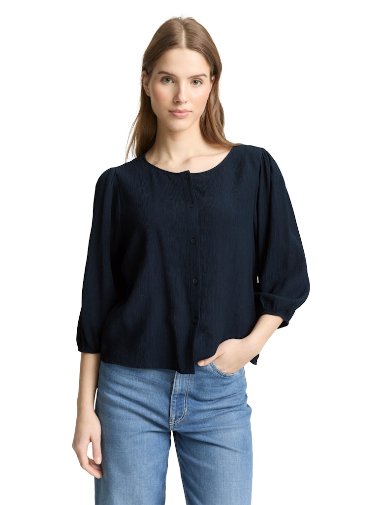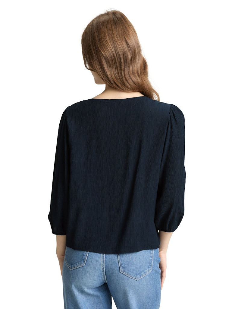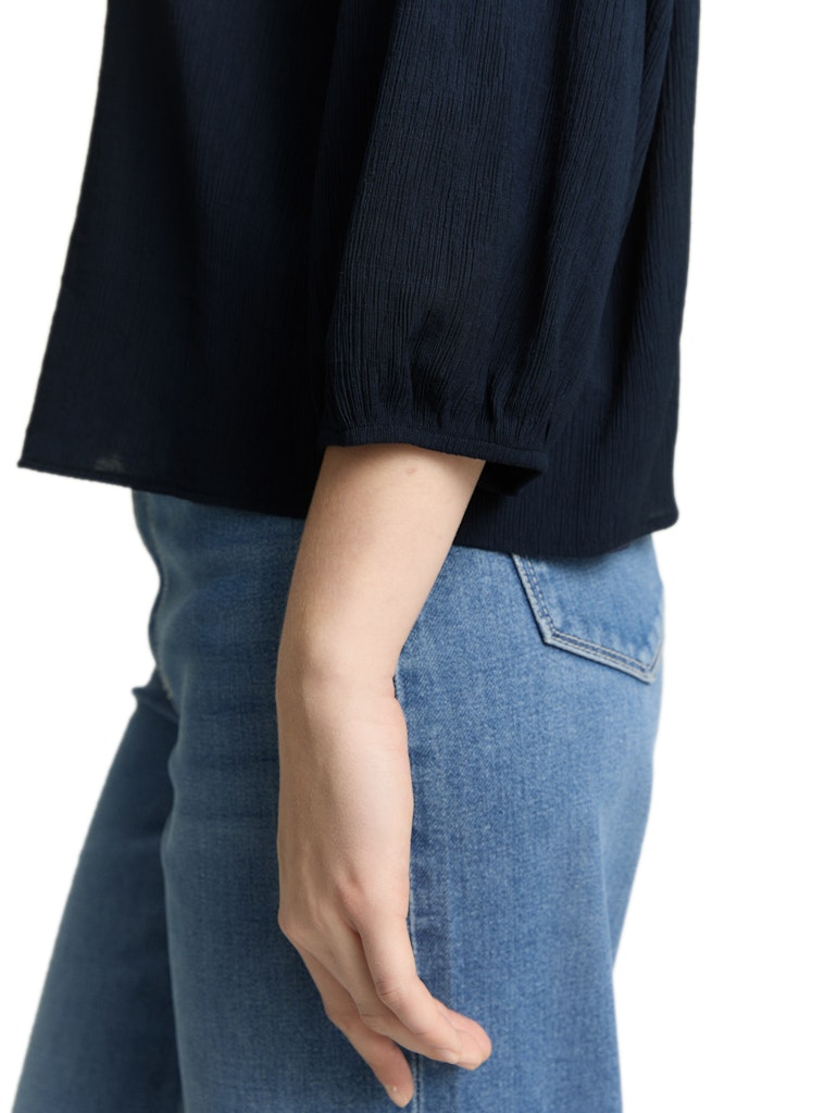 Feminine Bluse mit leichten Raffungen an den Schultern und elastischem Gummibund am Ärmelsaum. Aus einem strukturierten Krepp-Material in Knitteroptik.