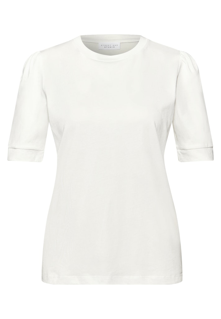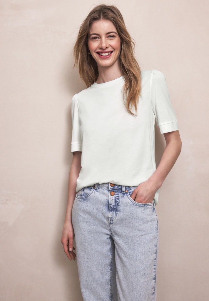 Das T-Shirt von Street One Studio für Damen setzt mit seinen Puffärmeln einen verspielten Akzent in deinem Outfit. Der Rundhalsausschnitt und der weiche Baumwoll-Modalmix sorgen für ein angenehm weiches Tragegefühl. In der unifarbenen Optik lässt sich das Shirt besonders einfach kombinieren und vielseitig stylen. Ideal für moderne Casual-Looks mit einem femininen Twist. Jerseyshirt Casual Rundhals Kurzarm Verspieltes Detail Material: 50% Modal, 50% Baumwolle