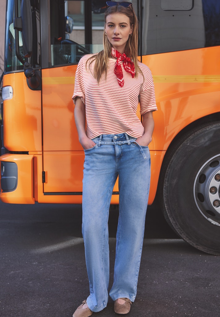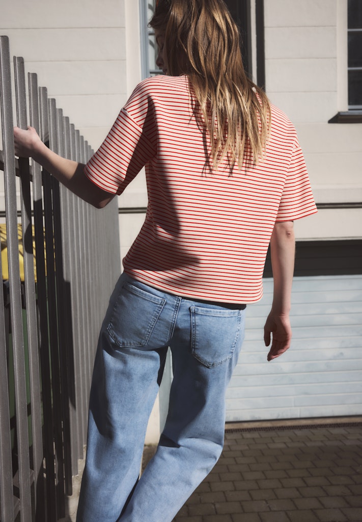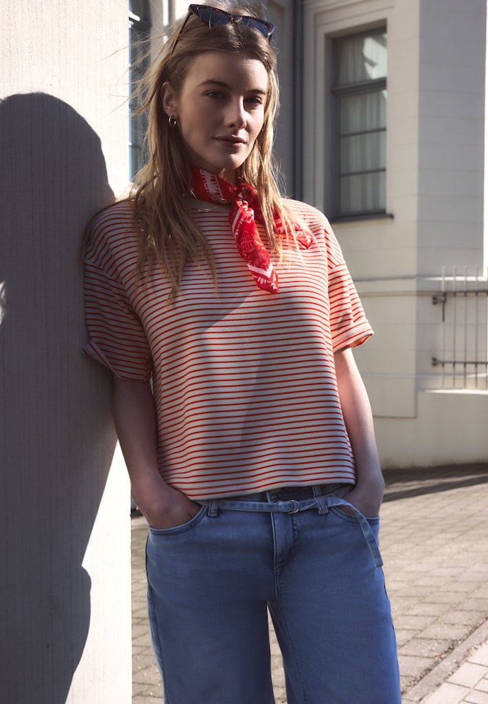 Das fein gestreifte Shirt von Street One Studio für Damen kombiniert eine moderne Optik mit dem soften Handfeel eines Viskosemixes mit Stretchanteil. Der Rundhalsausschnitt und die kurzen Ärmel betonen den unkomplizierten, vielseitigen Charakter. Das dezente Streifenmuster lässt sich mühelos zu vielen Outfits stylen. Ein ideales Shirt für komfortable, moderne Casual-Looks. Scuba Shirt Casual Rundhals Kurzarm Vielseitiger Allrounder Material: 72% Viskose, 23% Polyester, 5% Elasthan