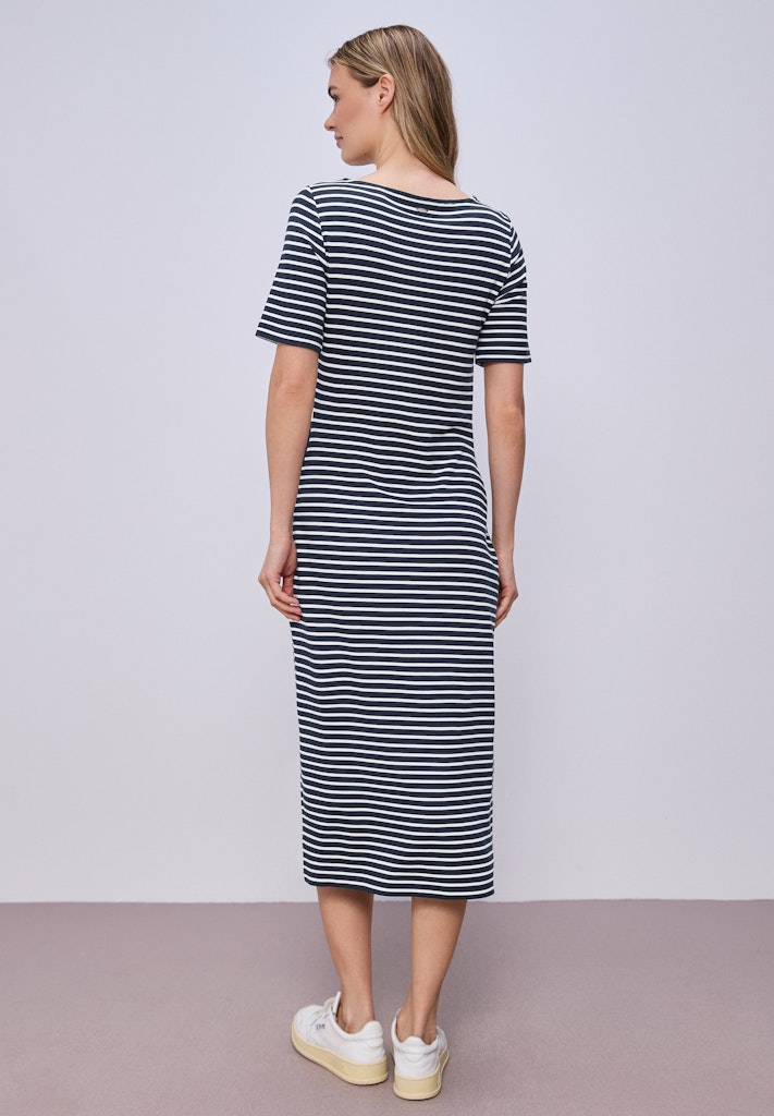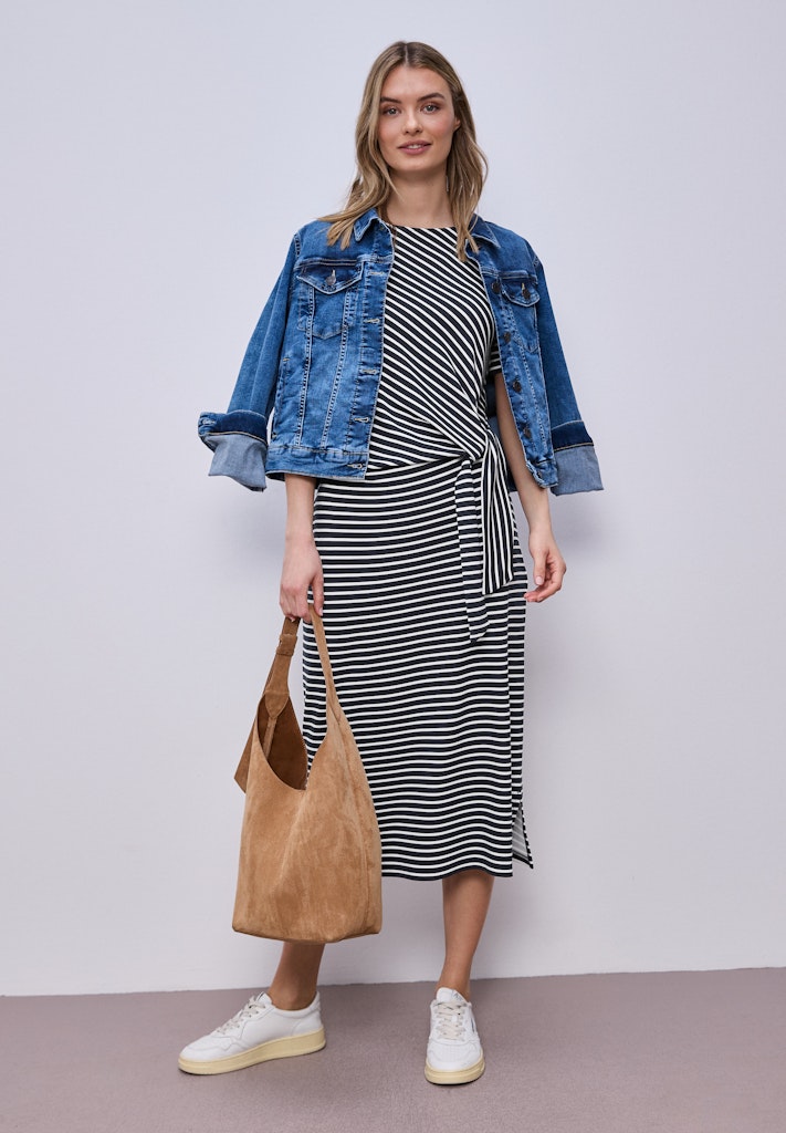 Dieses gestreifte Jerseykleid von Street One für Damen bietet dir dank seines soften Viskosemixes mit Stretchanteil ein bequemes Tragegefühl und eine fließende Optik. Das seitliche Knotendetail formt eine feminine Silhouette und setzt einen charmanten Akzent. Rundhals, Kurzarm und seitliche Schlitze betonen den lässigen Casual-Style. Ein ideales Midi-Kleid für moderne Looks. Jerseykleid Casual Rundhals Kurzarm Weich fallend Material: 85% Viskose, 13% Polyester, 2% Elasthan