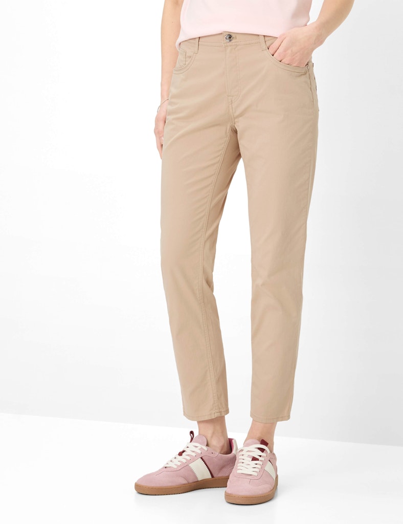 Mit den ersten warmen Sonnenstrahlen des Frühlings erwacht die Lust auf neue Mode. Diese Five-Pocket-Hose im STYLE MARY S präsentiert sich als ideales Essential für die kommende Saison. Die Damenhose überzeugt durch ihre klassische Passform im Regular Fit, die eine gerade Silhouette mit einer normalen Leibhöhe harmonisch kombiniert. Praktische Details sind die charakteristischen aufgesetzten Gesäßtaschen, die kleine Coinpocket sowie die vorderen Einschubtaschen. Die verkürzte Schrittlänge verleiht dem zeitlosen Design eine sommerliche Leichtigkeit, die durch dezente Nieten, feine Paspeln und formgebende Teilungsnähte sportiv abgerundet wird. Für ein spürbar angenehmes Tragegefühl sorgt bei dieser Hose der hochwertige Materialmix, bei dem die natürliche Atmungsaktivität der Baumwolle auf den weichen Griff von Lyocell und die flexible Dehnbarkeit von Elasthan trifft. Dieser Satin besticht zudem durch seinen edlen, feinen Glanz, wodurch die aktuellen Farbtöne besonders schön zur Geltung kommen. Aufgrund der Ultralight-Qualität punktet die Five-Pocket-Hose darüber hinaus mit besonderer Leichtigkeit und bestem Tragekomfort.