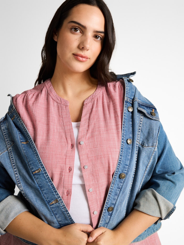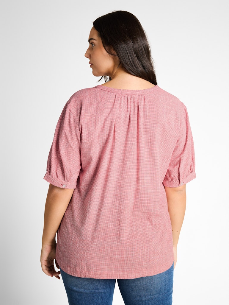 Bluse mit V-Ausschnitt und Knopfleiste. Mit Raffungen an den Schultern und an den Ärmeln. Aus einem leicht strukturierten Baumwollstoff.