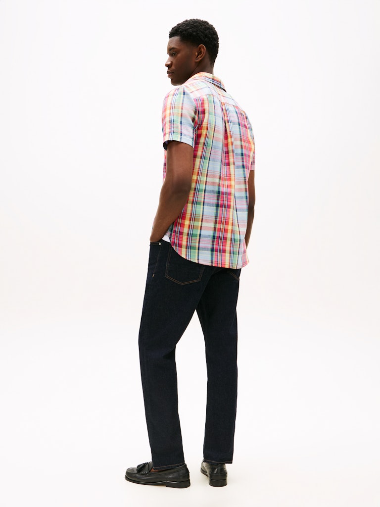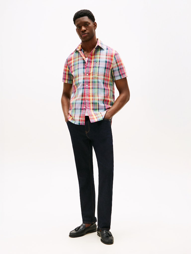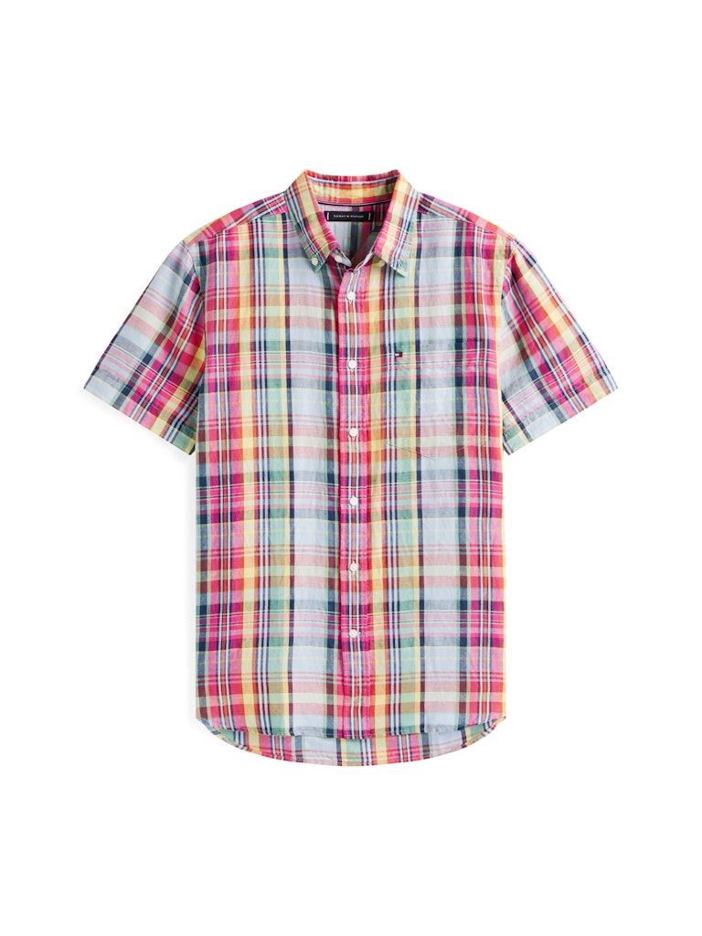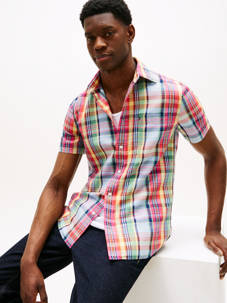 Opt for vibrant visual appeal in this short-sleeved button-down shirt, its linen-blend fabric adorned with a colourful madras check.Highlights