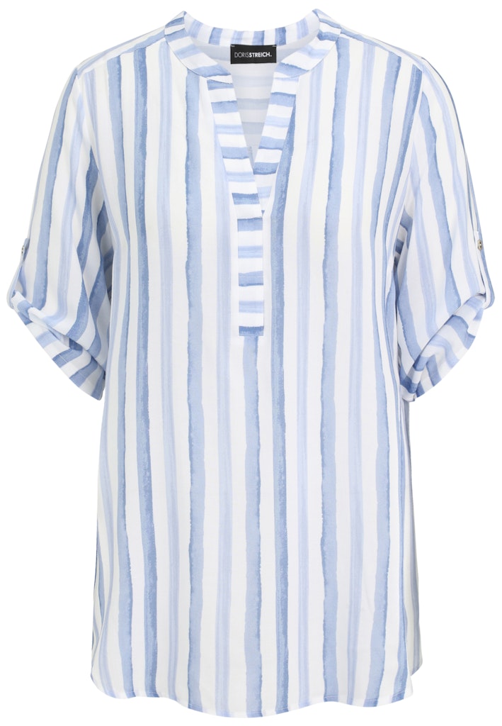 Die Schlupfbluse von Doris Streich besticht durch ihren cleanen Streifen-Print. Das weiche Viskose-Material, die fließende Passform mit Rückenpasse und tiefer Falte, sowie den Seitenschlitzen umspielt Ihre Figur perfekt. Die 3/4-Ärmel lassen sich