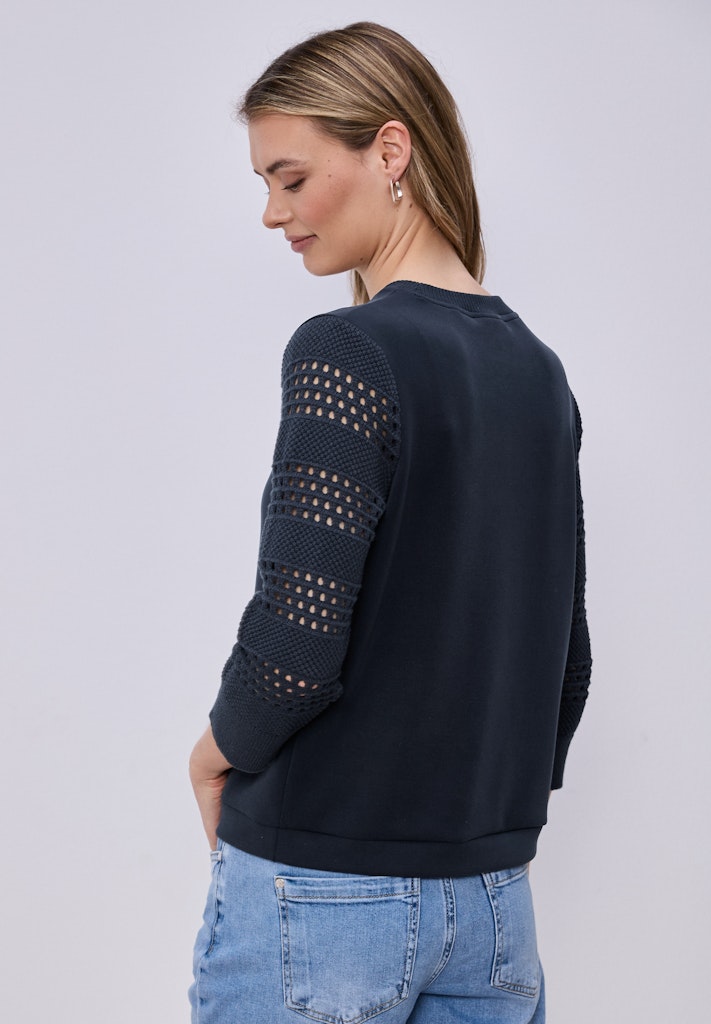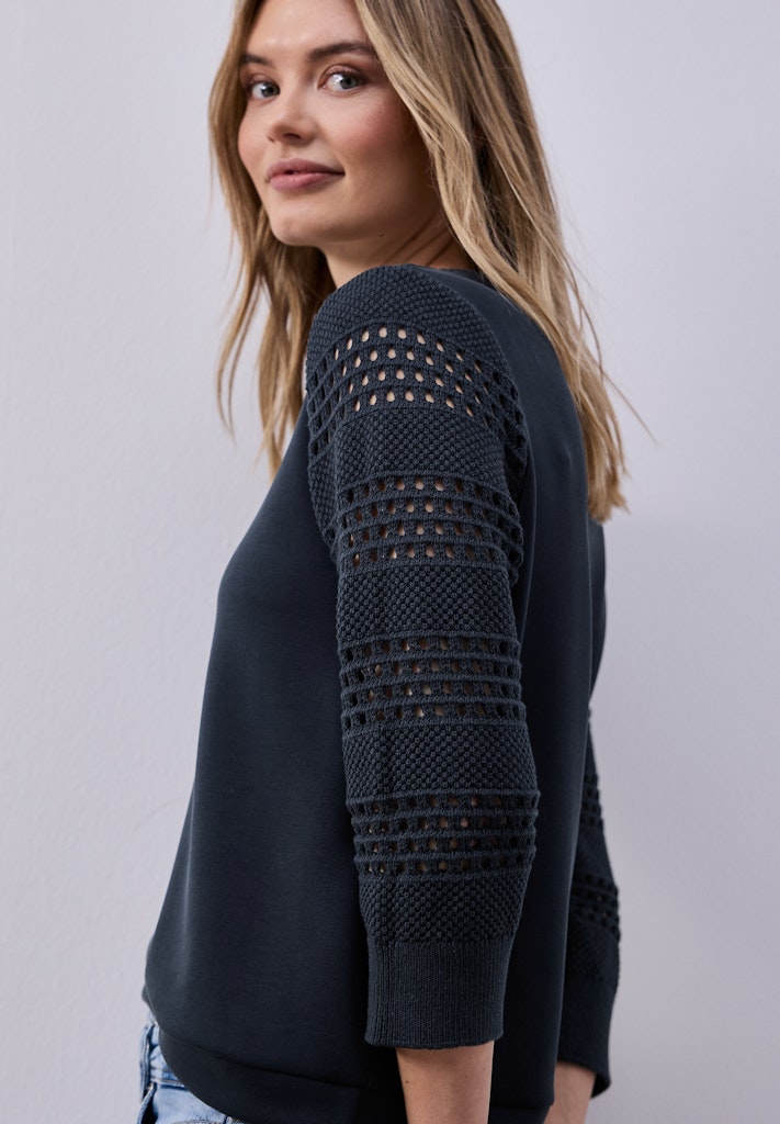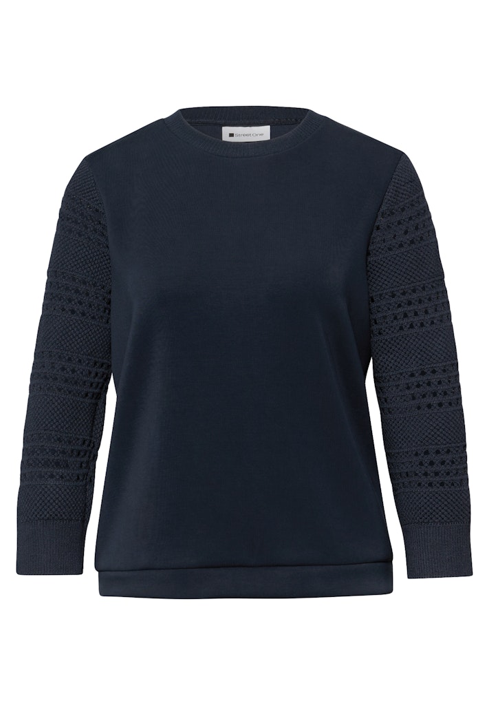 Dieses besondere Shirt von Street One begeistert mit einem spannenden Strukturmix aus seidigem Body und auffälligen Ärmeln in Lochstrick-Optik. Der sanfte Glanz des soften Modalmixes verleiht dem Silk-Look eine edle Note. Der Rundhalsausschnitt und die 3/4-Ärmel runden das feminine Design ab. Ein modisches Highlight, das angenehm zu tragen ist und jedes Outfit aufwertet. Silk-Look Shirt mit Ärmeln in Strick-Optik Casual Rundhals 3/4-Arm Spannender Strukturmix Material: 46% Modal, 46% Polyester, 8% Elasthan