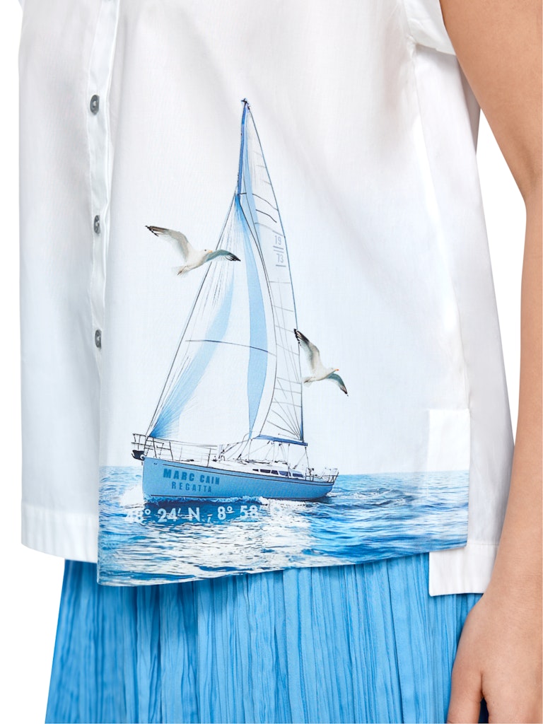Bluse mit maritimem Print|Lockere Bluse mit kurzen Ärmeln und weitem, entspanntem Schnitt. Die Bluse ist aus reiner Baumwolle gefertigt und liegt angenehm auf der Haut. Weitere Details sind der klassische Kragen und die durchgängige Knopfleiste. Highlight ist der Aufdruck auf der unteren Vorderseite, der der Bluse einen maritimen Touch verleiht und ein Schiff auf dem Meer zeigt. Seitlich sind kleine Schlitze eingearbeitet.|Kastiger Schnitt|Knopfleiste|Reine Baumwolle|Maritimer Aufdruck|Das Model ist 179 cm groß und trägt N3/38.