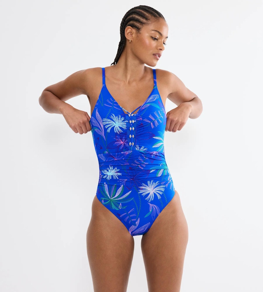 Dieser gefütterte Badeanzug bietet verstellbare Träger und ein modernes Detail am Steg, elegante Raffungen sowie dekorative Metall-Accessoires. Die mittlere Bedeckung sorgt dabei für einen hochwertigen, makellosen Look. Dank GRS-zertifiziertem Shaping-Stoff aus 55 % recyceltem Polyamid gelingt dem Style die perfekte Kombination aus Halt und Langlebigkeit.